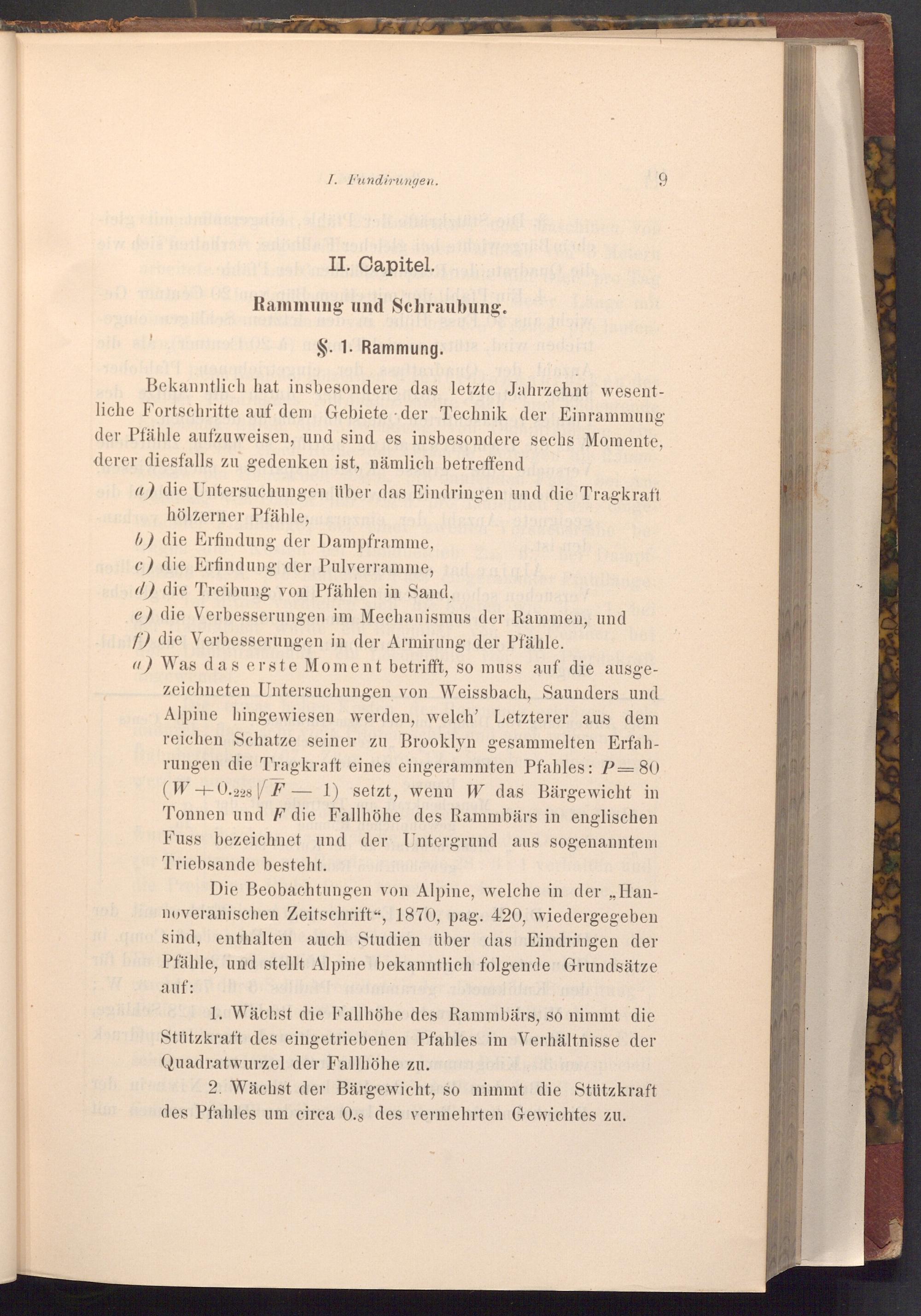 Die Beobachtungen von Alpine, welche in der„, Hannoveranischen Zeitschrift", 1870, pag. 420, wiedergegeben quo sind, enthalten auch Studien über das Eindringen der Pfähle, und stellt Alpine bekanntlich folgende Grundsätze.