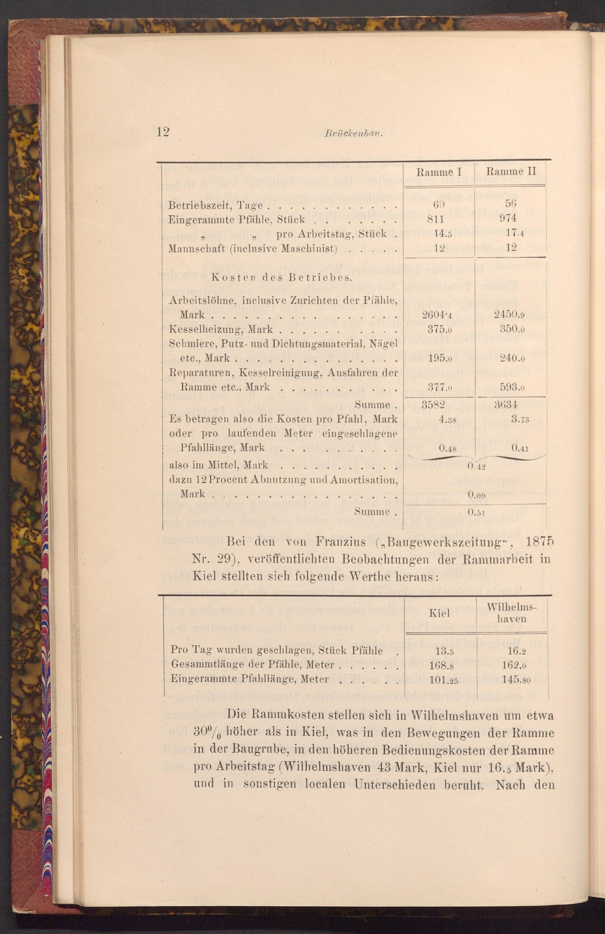 Bei den von Franzius(, Baugewerkszeitung", 1875 Nr. 29), veröffentlichten Beobachtungen der Rammarbeit in Kiel stellten sich folgende Werthe heraus: