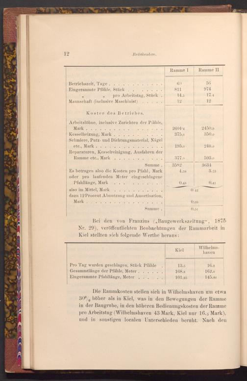 Die Rammkosten stellen sich in Wilhelmshaven um etwa 30% höher als in Kiel, was in den Bewegungen der Ramme in der Baugrube, in den höheren Bedienungskosten der Ramme bapro Arbeitstag( Wilhelmshaven 43 Mark, Kiel nur 16., Mark),