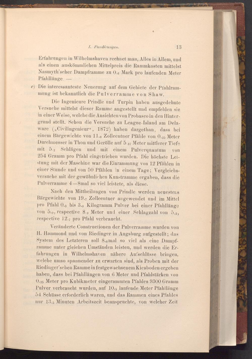 Erfahrungen in Wilhelmshaven rechnet man, Alles in Allem, und als einen auskömmlichen Mittelpreis die Rammkosten mittelst Nasmyth'scher Dampframme zu 0.6 Mark pro laufenden Meter Pfahllänge.