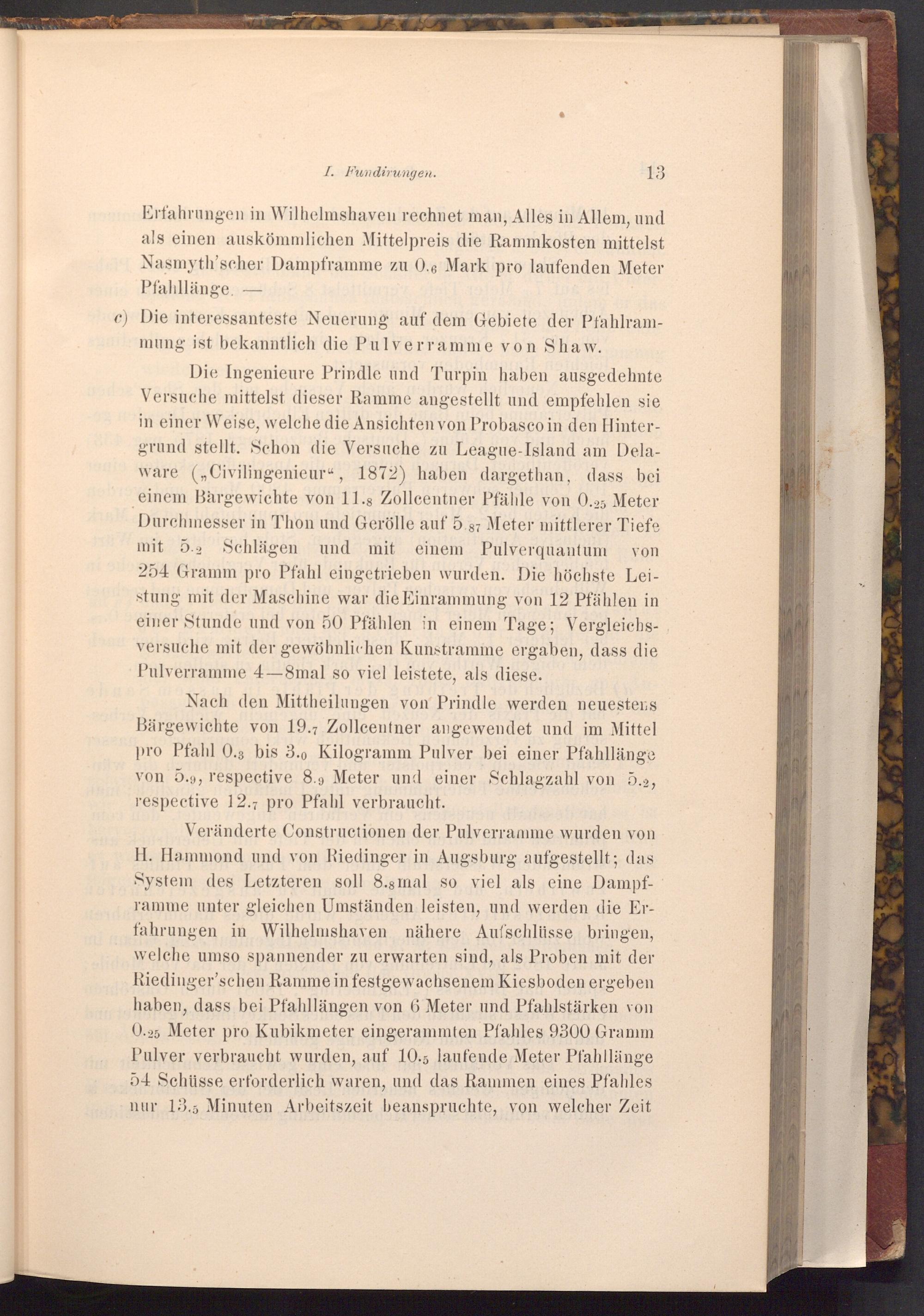 Veränderte Constructionen der Pulverramme wurden von H. Hammond und von Riedinger in Augsburg aufgestellt; das System des Letzteren soll 8.8 mal so viel als eine Dampframme unter gleichen Umständen leisten, und werden die Erfahrungen in Wilhelmshaven nähere Aufschlüsse bringen, welche umso spannender zu erwarten sind, als Proben mit der Riedinger'schen Ramme in festgewachsenem Kiesboden ergeben haben, dass bei Pfahllängen von 6 Meter und Pfahlstärken von 0.25 Meter pro Kubikmeter eingerammten Pfahles 9300 Gramm Pulver verbraucht wurden, auf 10.5 laufende Meter Pfahllänge 54 Schüsse erforderlich waren, und das Rammen eines Pfahles nur 13.5 Minuten Arbeitszeit beanspruchte, von welcher Zeit
