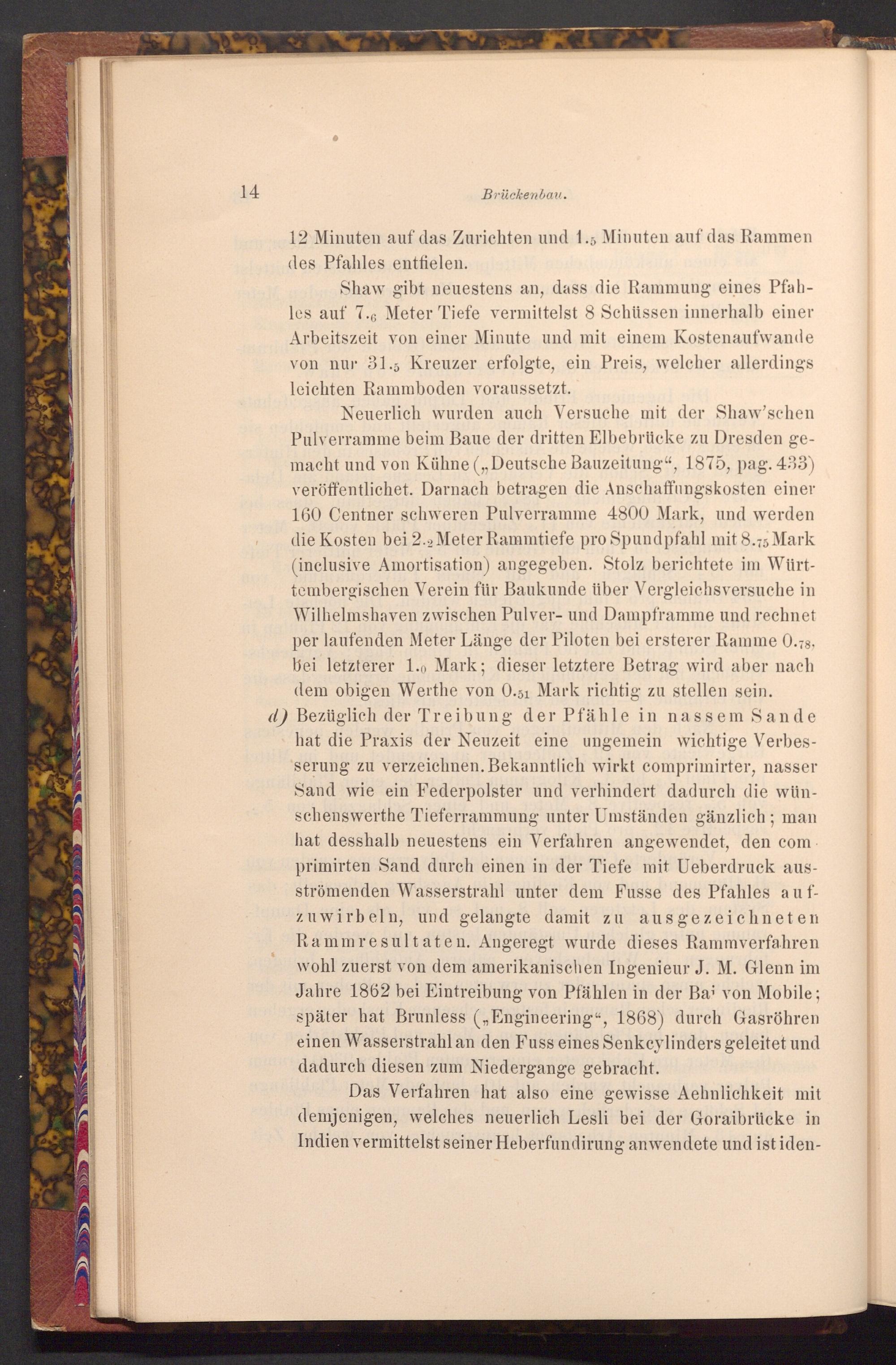 Neuerlich wurden auch Versuche mit der Shaw'schen Pulverramme beim Baue der dritten Elbebrücke zu Dresden gemacht und von Kühne( ,, Deutsche Bauzeitung", 1875, pag. 433) veröffentlichet. Darnach betragen die Anschaffungskosten einer 160 Centner schweren Pulverramme 4800 Mark, und werden die Kosten bei 2.2 Meter Rammtiefe pro Spundpfahl mit 8.75 Mark ( inclusive Amortisation) angegeben. Stolz berichtete im Württembergischen Verein für Baukunde über Vergleichsversuche in Wilhelmshaven zwischen Pulver- und Dampframme und rechnet per laufenden Meter Länge der Piloten bei ersterer Ramme 0.78, bei letzterer 1.0 Mark; dieser letztere Betrag wird aber nach dem obigen Werthe von 0.51 Mark richtig zu stellen sein. d) Bezüglich der Treibung der Pfähle in nassem Sande hat die Praxis der Neuzeit eine ungemein wichtige Verbesserung zu verzeichnen. Bekanntlich wirkt comprimirter, nasser Sand wie ein Federpolster und verhindert dadurch die wünschenswerthe Tieferrammung unter Umständen gänzlich; man hat desshalb neuestens ein Verfahren angewendet, den com primirten Sand durch einen in der Tiefe mit Ueberdruck ausströmenden Wasserstrahl unter dem Fusse des Pfahles aufzuwirbeln, und gelangte damit zu ausgezeichneten Rammresultaten. Angeregt wurde dieses Rammverfahren wohl zuerst von dem amerikanischen Ingenieur J. M. Glenn im Jahre 1862 bei Eintreibung von Pfählen in der Bai von Mobile; später hat Brunless(„ Engineering", 1868) durch Gasröhren einen Wasserstrahl an den Fuss eines Senkeylinders geleitet und dadurch diesen zum Niedergange gebracht.