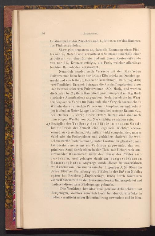 Shaw gibt neuestens an, dass die Rammung eines Pfahles auf 7.6 Meter Tiefe vermittelst 8 Schüssen innerhalb einer Arbeitszeit von einer Minute und mit einem Kostenaufwande von nur 31.5 Kreuzer erfolgte, ein Preis, welcher allerdings leichten Rammboden voraussetzt.