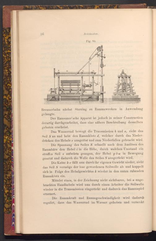 Das Wasserrad bewegt die Transmission 6 und a, zieht das Seil S an und hebt den Rammklotz d, welcher durch das Niederdrücken des Hebels e ausgelöst und zum Niederfallen gebracht wird. Die Spannung des Seiles S schnellt nach dem Auslösen des Rammbärs den Hebel i in die Höhe, durch welchen Umstand ein straffes Seils aufwärts gezogen, der Hebel g- l- n in Bewegung gesetzt und dadurch die Welle des Seiles S ausgerückt wird.