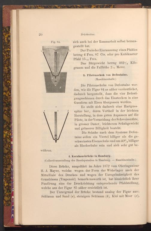 Diese Brücke, ausgeführt im Jahre 1872 vom Oberingenieur H. A. Mayer, welche wegen der Form der Widerlager nach der Mittellinie des Druckes und wegen der Unregelmässigkeit des Grundrisses( Trapezoid) bemerkenswerth ist, hat hinsichtlich ihrer Fundirung eine der Druckrichtung entsprechende Pfahlstellung, welche aus der Figur 85 näher ersichtlich ist.
