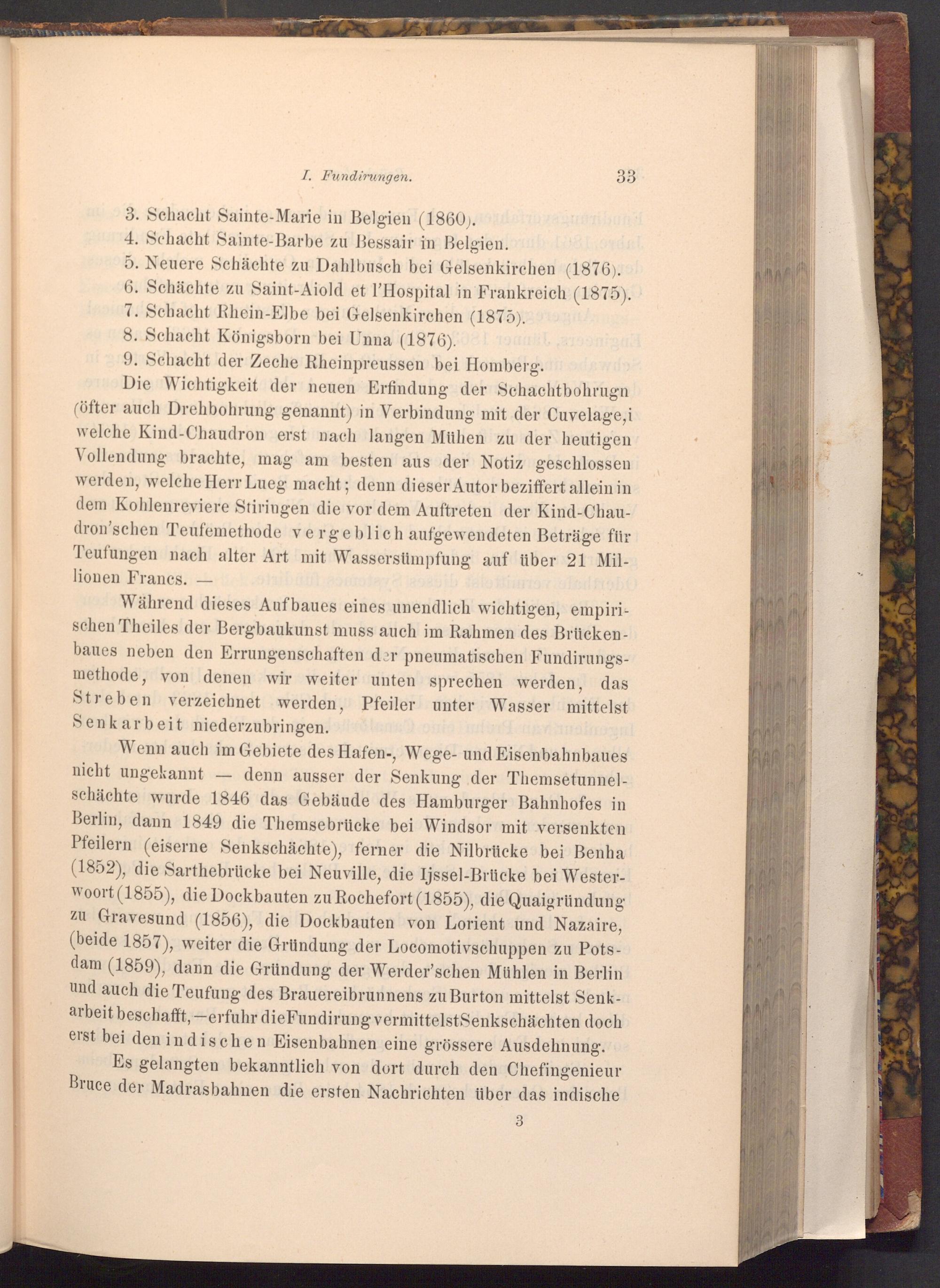 Wenn auch im Gebiete des Hafen-, Wege- und Eisenbahnbaues nicht ungekannt denn ausser der Senkung der Themsetunnelschächte wurde 1846 das Gebäude des Hamburger Bahnhofes in Berlin, dann 1849 die Themsebrücke bei Windsor mit versenkten Pfeilern( eiserne Senkschächte), ferner die Nilbrücke bei Benha ( 1852), die Sarthebrücke bei Neuville, die Ijssel- Brücke bei Westerwoort( 1855), die Dockbauten zu Rochefort( 1855), die Quaigründung zu Gravesund( 1856), die Dockbauten von Lorient und Nazaire, ( beide 1857), weiter die Gründung der Locomotivschuppen zu Potsdam( 1859), dann die Gründung der Werder'schen Mühlen in Berlin und auch die Teufung des Brauereibrunnens zu Burton mittelst Senkarbeit beschafft, erfuhr die Fundirung vermittelst Senkschächten doch erst bei den indischen Eisenbahnen eine grössere Ausdehnung.