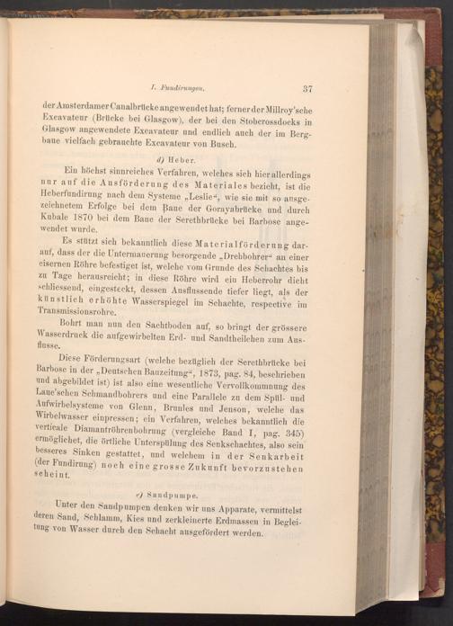Ein höchst sinnreiches Verfahren, welches sich hier allerdings nur auf die Ausförderung des Materiales bezieht, ist die Heberfundirung nach dem Systeme„ Leslie", wie sie mit so ausgezeichnetem Erfolge bei dem Baue der Gorayabrücke und durch Kubale 1870 bei dem Baue der Serethbrücke bei Barbose angewendet wurde.