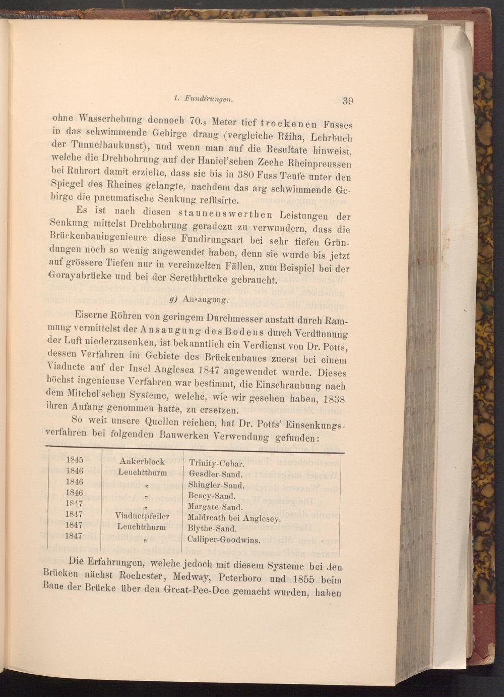 Eiserne Röhren von geringem Durchmesser anstatt durch Rammung vermittelst der Ansaugung des Bodens durch Verdünnung der Luft niederzusenken, ist bekanntlich ein Verdienst von Dr. Potts, dessen Verfahren im Gebiete des Brückenbaues zuerst bei einem Viaducte auf der Insel Anglesea 1847 angewendet wurde. Dieses höchst ingenieuse Verfahren war bestimmt, die Einschraubung nach dem Mitchel'schen Systeme, welche, wie wir gesehen haben, 1838 ihren Anfang genommen hatte, zu ersetzen.