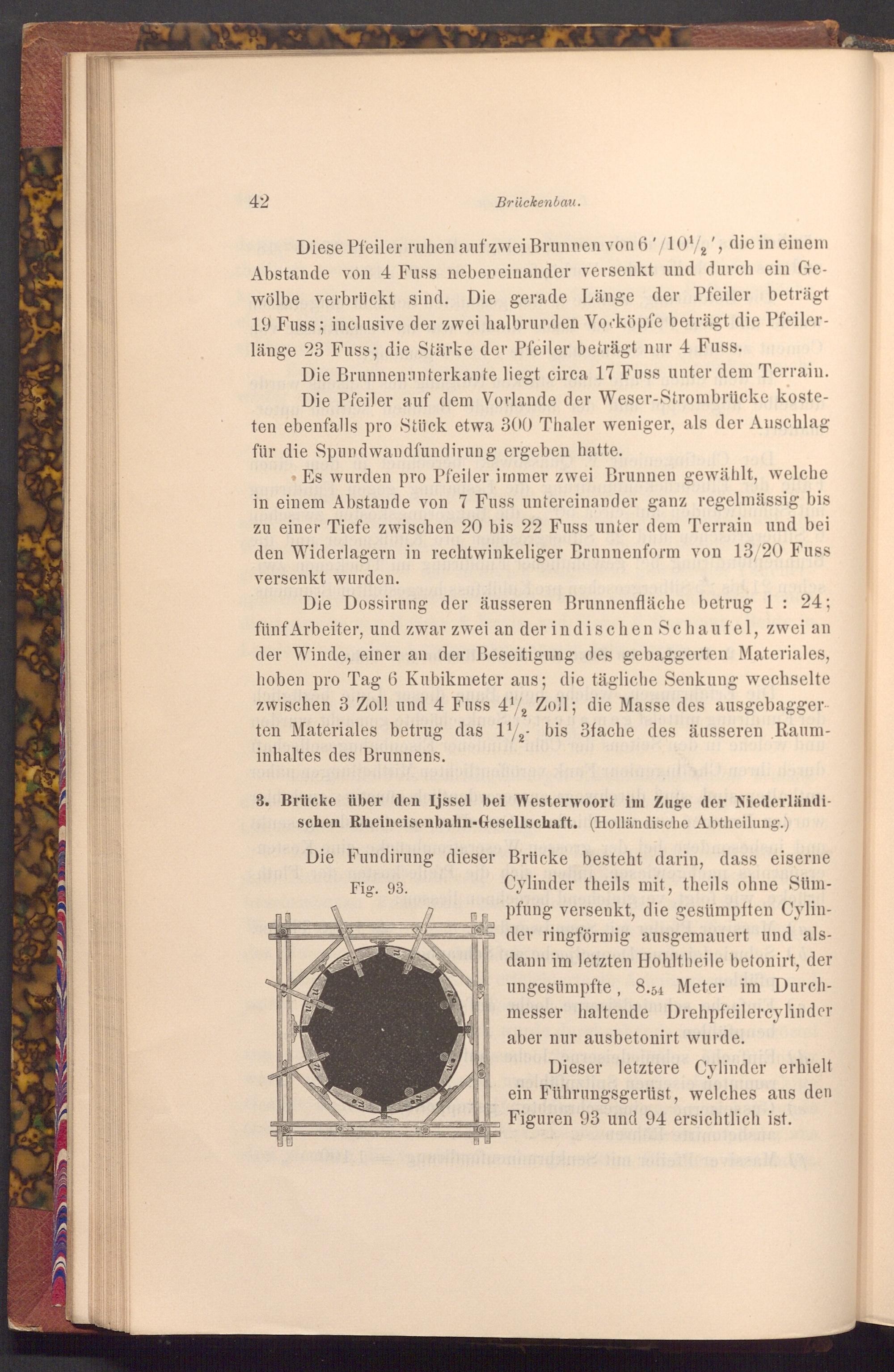 Die Brunnenunterkante liegt circa 17 Fuss unter dem Terrain. Die Pfeiler auf dem Vorlande der Weser- Strombrücke kosteten ebenfalls pro Stück etwa 300 Thaler weniger, als der Auschlag für die Spundwandfundirung ergeben hatte.