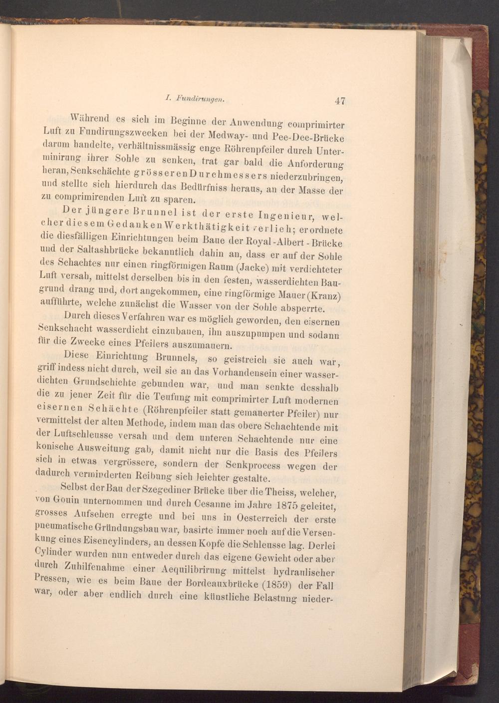Selbst der Bau der Szegediner Brücke über die Theiss, welcher, von Gouin unternommen und durch Cesanne im Jahre 1875 geleitet, grosses Aufsehen erregte und bei uns in Oesterreich der erste pneumatische Gründungsbau war, basirte immer noch auf die Versenkung eines Eisencylinders, an dessen Kopfe die Schleusse lag. Derlei Cylinder wurden nun entweder durch das eigene Gewicht oder aber durch Zuhilfenahme einer Aequilibrirung mittelst hydraulischer Pressen, wie es beim Baue der Bordeauxbrücke( 1859) der Fall war, oder aber endlich durch eine künstliche Belastung nieder