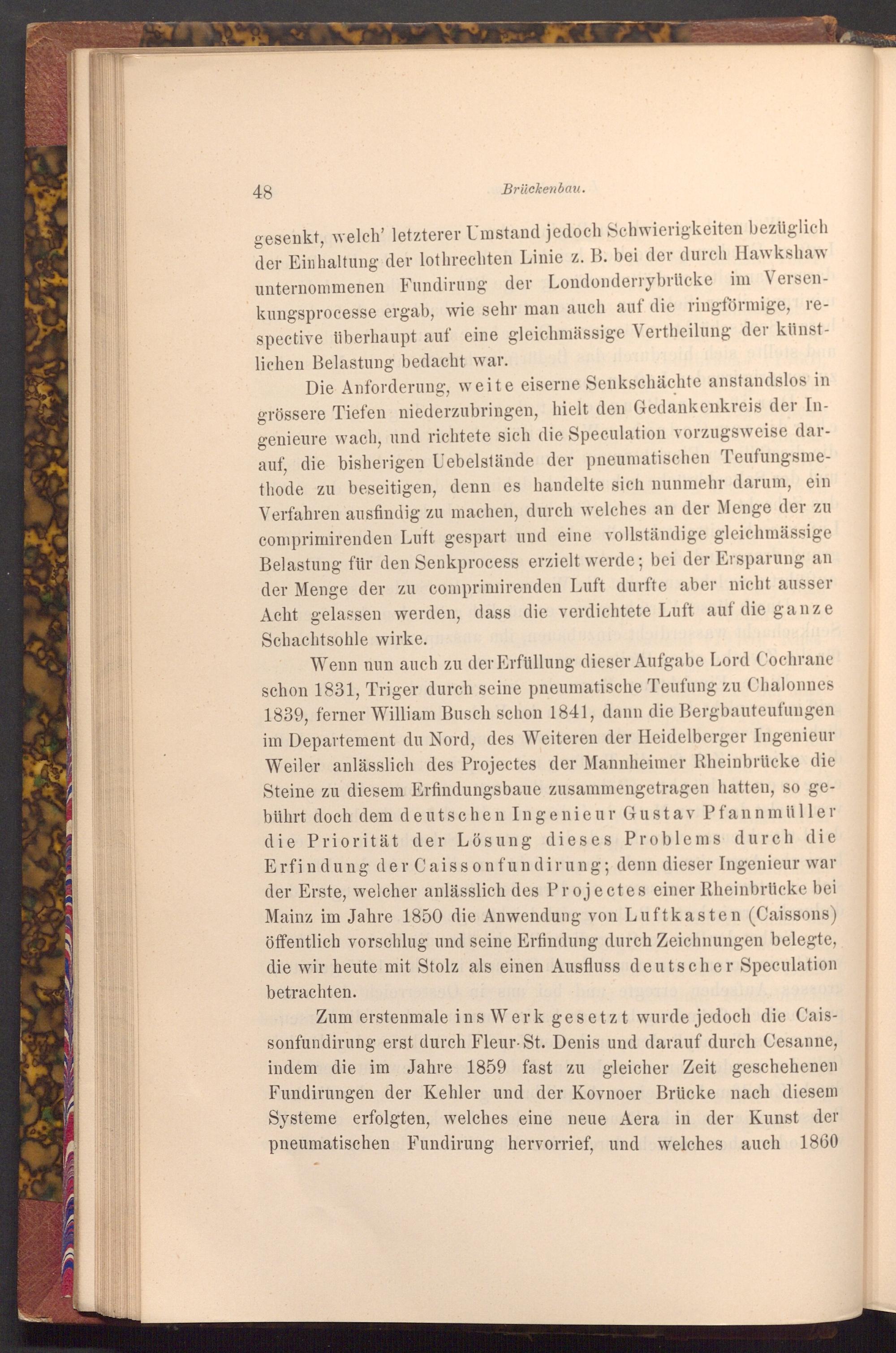 Wenn nun auch zu der Erfüllung dieser Aufgabe Lord Cochrane schon 1831, Triger durch seine pneumatische Teufung zu Chalonnes 1839, ferner William Busch schon 1841, dann die Bergbauteufungen im Departement du Nord, des Weiteren der Heidelberger Ingenieur Weiler anlässlich des Projectes der Mannheimer Rheinbrücke die Steine zu diesem Erfindungsbaue zusammengetragen hatten, so gebührt doch dem deutschen Ingenieur Gustav Pfannmüller die Priorität der Lösung dieses Problems durch die Erfindung der Caissonfundirung; denn dieser Ingenieur war der Erste, welcher anlässlich des Projectes einer Rheinbrücke bei Mainz im Jahre 1850 die Anwendung von Luftkasten( Caissons) öffentlich vorschlug und seine Erfindung durch Zeichnungen belegte, die wir heute mit Stolz als einen Ausfluss deutscher Speculation betrachten.