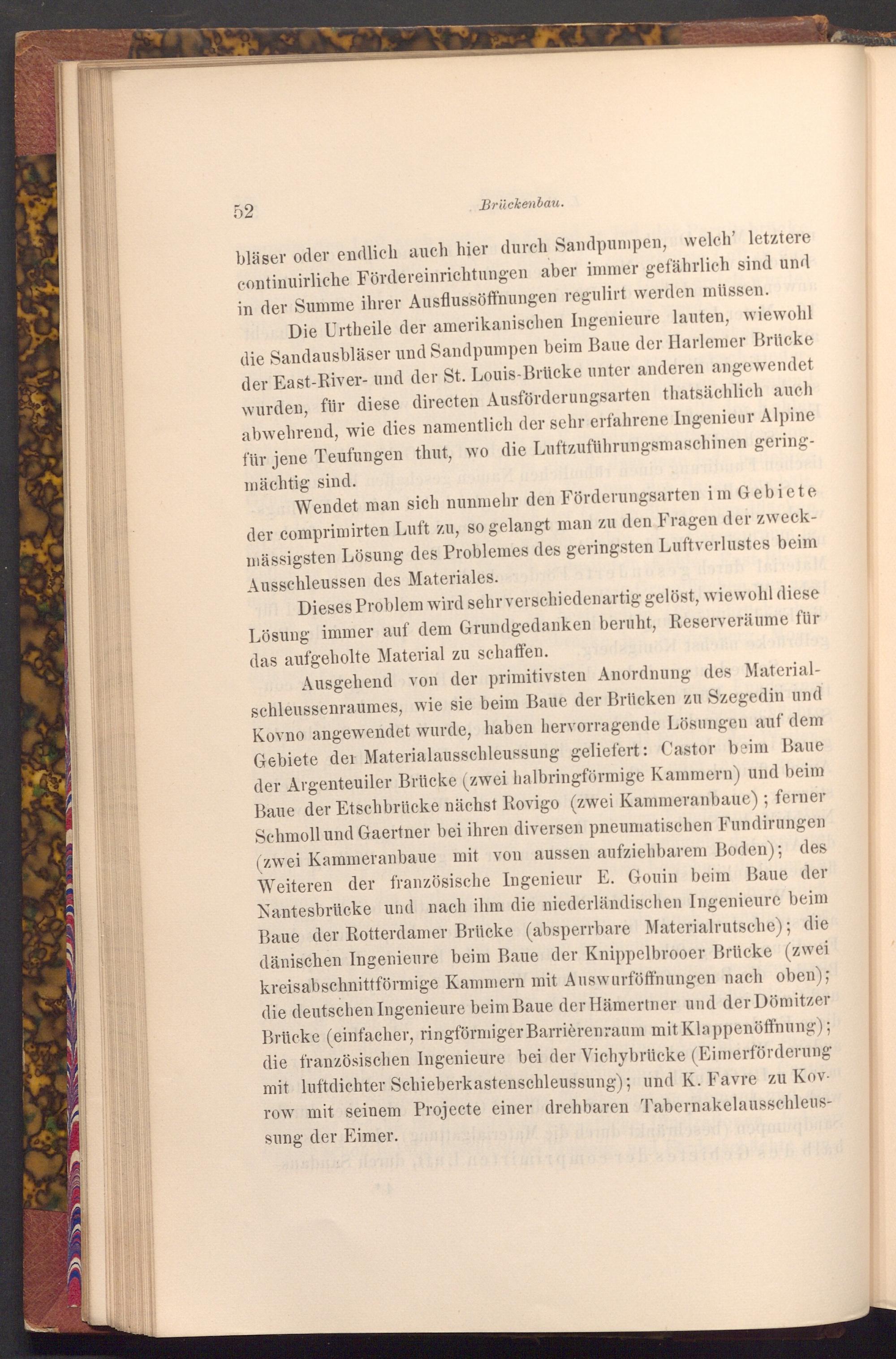 Ausgehend von der primitivsten Anordnung des Materialschleussenraumes, wie sie beim Baue der Brücken zu Szegedin und Kovno angewendet wurde, haben hervorragende Lösungen auf dem Gebiete der Materialausschleussung geliefert: Castor beim Baue der Argenteuiler Brücke( zwei halbringförmige Kammern) und beim Baue der Etschbrücke nächst Rovigo( zwei Kammeranbaue); ferner Schmoll und Gaertner bei ihren diversen pneumatischen Fundirungen ( zwei Kammeranbaue mit von aussen aufziehbarem Boden); des Weiteren der französische Ingenieur E. Gouin beim Baue der Nantesbrücke und nach ihm die niederländischen Ingenieure beim Baue der Rotterdamer Brücke( absperrbare Materialrutsche); die dänischen Ingenieure beim Baue der Knippelbrooer Brücke( zwei kreisabschnittförmige Kammern mit Auswurföffnungen nach oben); die deutschen Ingenieure beim Baue der Hämertner und der Dömitzer Brücke( einfacher, ringförmiger Barrièrenraum mit Klappenöffnung); die französischen Ingenieure bei der Vichybrücke( Eimerförderung mit luftdichter Schieberkastenschleussung); und K. Favre zu Kovrow mit seinem Projecte einer drehbaren Tabernakelausschleussung der Eimer.