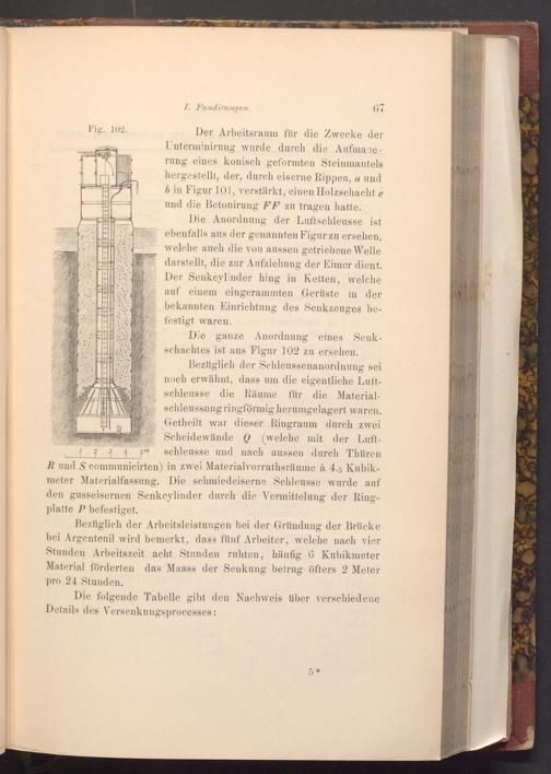 Bezüglich der Arbeitsleistungen bei der Gründung der Brücke bei Argenteuil wird bemerkt, dass fünf Arbeiter, welche nach vier Stunden Arbeitszeit acht Stunden ruhten, häufig 6 Kubikmeter Material förderten das Maass der Senkung betrug öfters 2 Meter pro 24 Stunden.