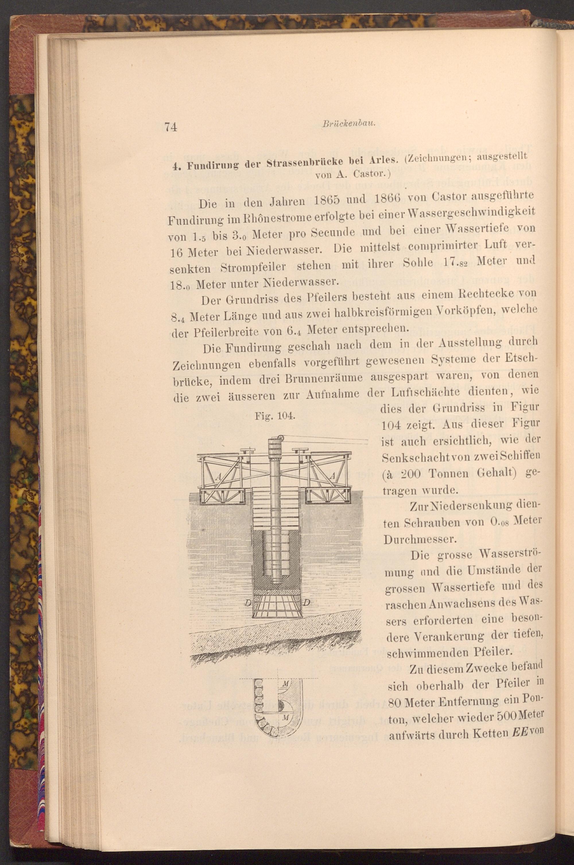 Die in den Jahren 1865 und 1866 von Castor ausgeführte Fundirung im Rhônestrome erfolgte bei einer Wassergeschwindigkeit von 1.5 bis 3.0 Meter pro Secunde und bei einer Wassertiefe von 16 Meter bei Niederwasser. Die mittelst comprimirter Luft versenkten Strompfeiler stehen mit ihrer Sohle 17.82 Meter und 18.0 Meter unter Niederwasser.