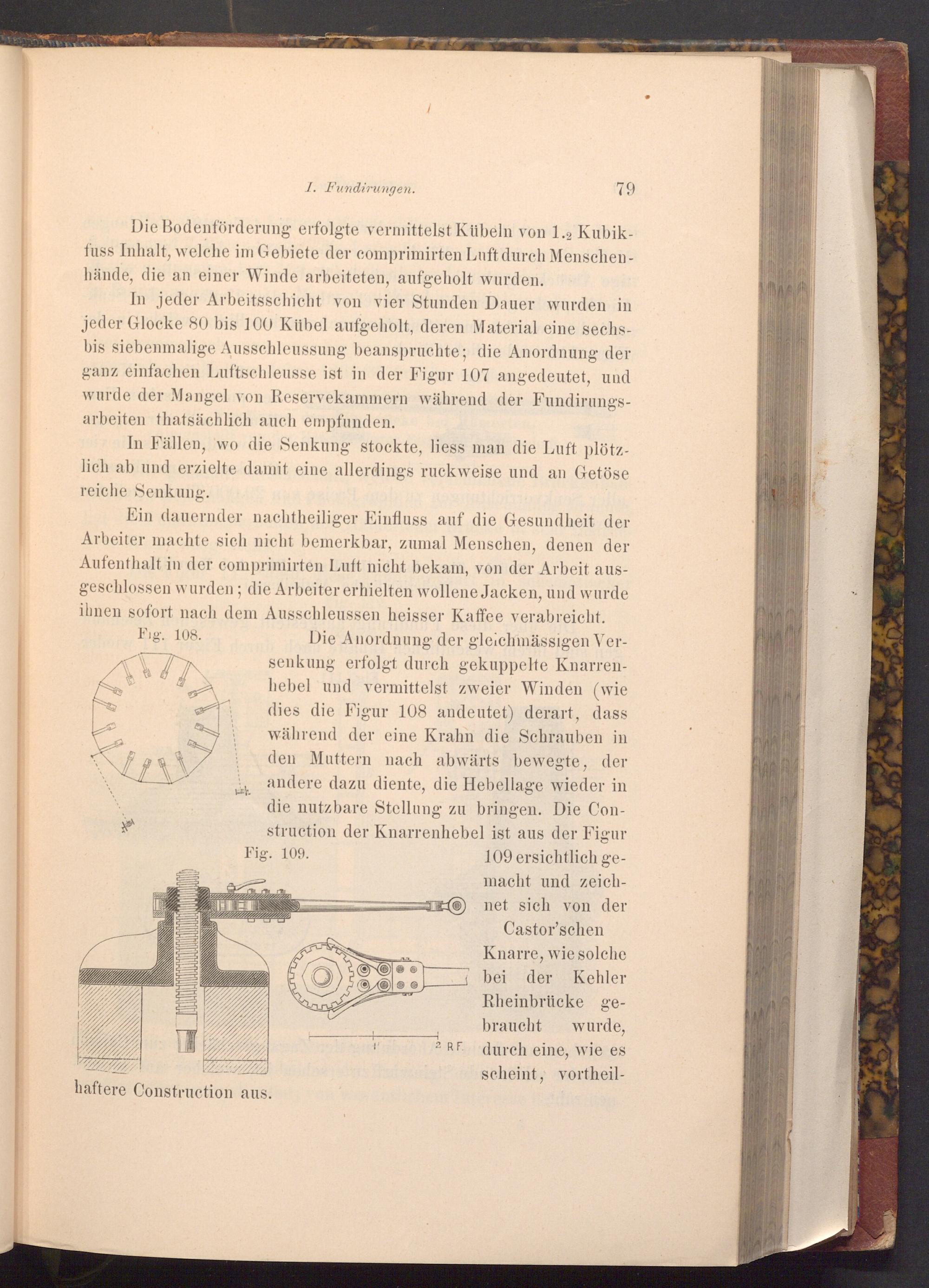 Die Anordnung der gleichmässigen Versenkung erfolgt durch gekuppelte Knarrenhebel und vermittelst zweier Winden( wie dies die Figur 108 andeutet) derart, dass während der eine Krahn die Schrauben in den Muttern nach abwärts bewegte, der andere dazu diente, die Hebellage wieder in die nutzbare Stellung zu bringen. Die Construction der Knarrenhebel ist aus der Figur Fig. 109.