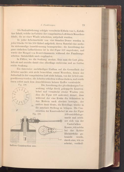 In jeder Arbeitsschicht von vier Stunden Dauer wurden in jeder Glocke 80 bis 100 Kübel aufgeholt, deren Material eine sechsbis siebenmalige Ausschleussung beanspruchte; die Anordnung der ganz einfachen Luftschleusse ist in der Figur 107 angedeutet, und wurde der Mangel von Reservekammern während der Fundirungsarbeiten thatsächlich auch empfunden.