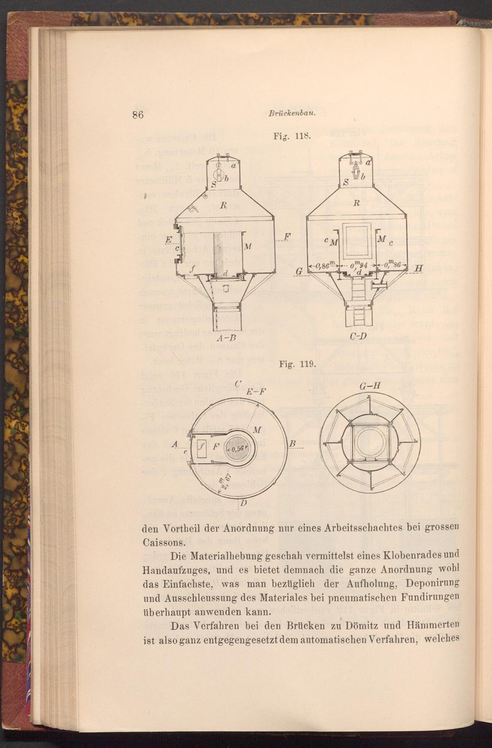 Die Materialhebung geschah vermittelst eines Klobenrades und Handaufzuges, und es bietet demnach die ganze Anordnung wohl das Einfachste, was man bezüglich der Aufholung, Deponirung und Ausschleussung des Materiales bei pneumatischen Fundirungen überhaupt anwenden kann.