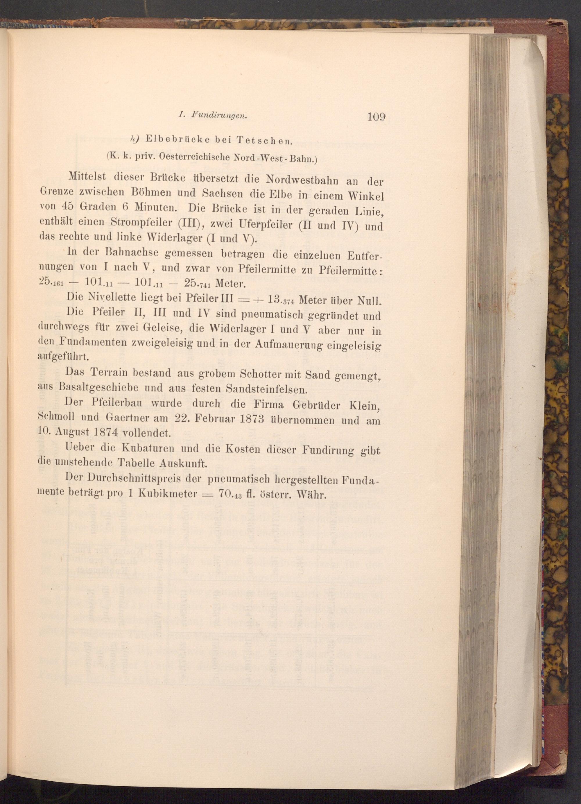 Mittelst dieser Brücke übersetzt die Nordwestbahn an der Grenze zwischen Böhmen und Sachsen die Elbe in einem Winkel von 45 Graden 6 Minuten. Die Brücke ist in der geraden Linie, enthält einen Strompfeiler( III), zwei Uferpfeiler( II und IV) und das rechte und linke Widerlager( I und V).