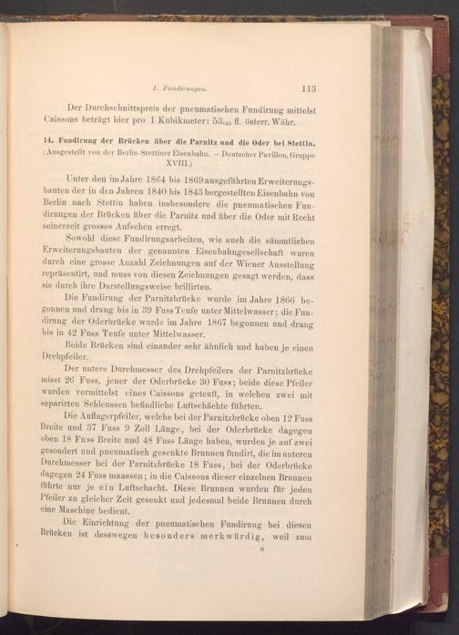 Die Fundirung der Parnitzbrücke wurde im Jahre 1866 begonnen und drang bis in 39 Fuss Teufe unter Mittelwasser; die Fundirung der Oderbrücke wurde im Jahre 1867 begonnen und drang bis in 42 Fuss Teufe unter Mittelwasser.