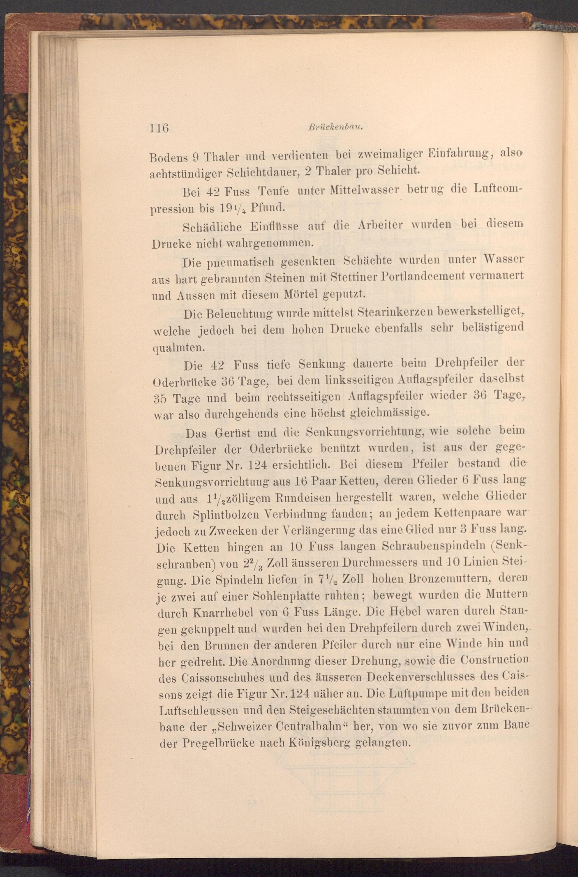 Das Gerüst und die Senkungsvorrichtung, wie solche beim Drehpfeiler der Oderbrücke benützt wurden, ist aus der gegebenen Figur Nr. 124 ersichtlich. Bei diesem Pfeiler bestand die Senkungsvorrichtung aus 16 Paar Ketten, deren Glieder 6 Fuss lang und aus 11/ zölligem Rundeisen hergestellt waren, welche Glieder durch Splintbolzen Verbindung fanden; an jedem Kettenpaare war jedoch zu Zwecken der Verlängerung das eine Glied nur 3 Fuss lang. Die Ketten hingen an 10 Fuss langen Schraubenspindeln( Senkschrauben) von 22, Zoll äusseren Durchmessers und 10 Linien Steigung. Die Spindeln liefen in 7%, Zoll hohen Bronzemuttern, deren je zwei auf einer Sohlenplatte ruhten; bewegt wurden die Muttern durch Knarrhebel von 6 Fuss Länge. Die Hebel waren durch Stangen gekuppelt und wurden bei den Drehpfeilern durch zwei Winden, bei den Brunnen der anderen Pfeiler durch nur eine Winde hin und her gedreht. Die Anordnung dieser Drehung, sowie die Construction des Caissonschuhes und des äusseren Deckenverschlusses des Caissons zeigt die Figur Nr. 124 näher an. Die Luftpumpe mit den beiden Luftschleussen und den Steigeschächten stammten von dem Brückenbaue der Schweizer Centralbahn" her, von wo sie zuvor zum Baue der Pregelbrücke nach Königsberg gelangten.