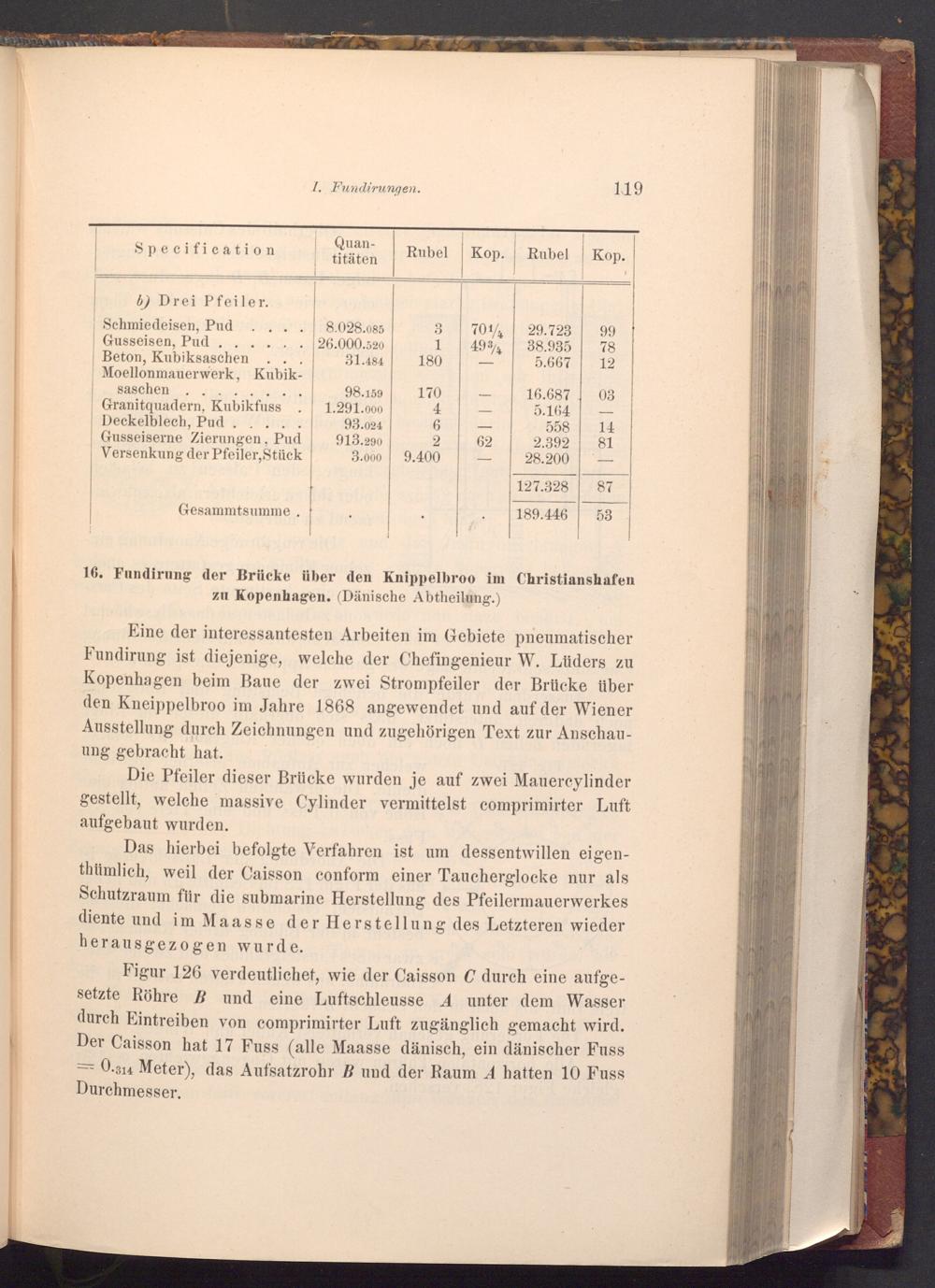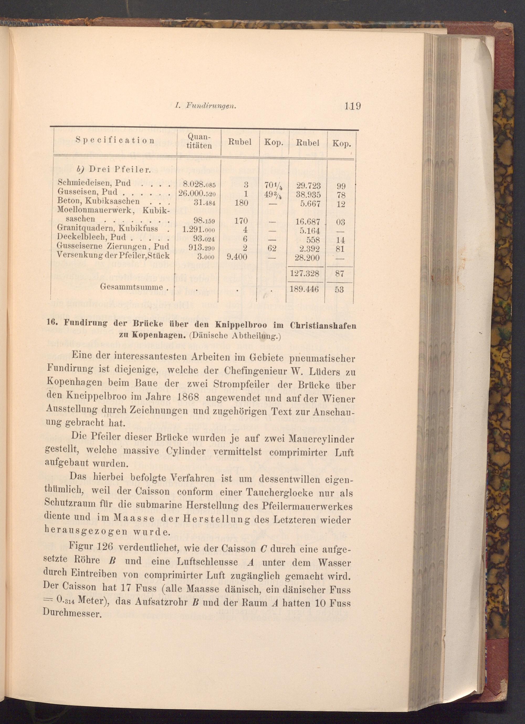 Figur 126 verdeutlichet, wie der Caisson C durch eine aufgesetzte Röhre B und eine Luftschleusse A unter dem Wasser durch Eintreiben von comprimirter Luft zugänglich gemacht wird. Der Caisson hat 17 Fuss( alle Maasse dänisch, ein dänischer Fuss