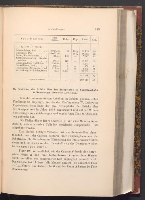 Eine der interessantesten Arbeiten im Gebiete pneumatischer Fundirung ist diejenige, welche der Chefingenieur W. Lüders zu Kopenhagen beim Baue der zwei Strompfeiler der Brücke über den Kneippelbroo im Jahre 1868 angewendet und auf der Wiener Ausstellung durch Zeichnungen und zugehörigen Text zur Anschauung gebracht hat.