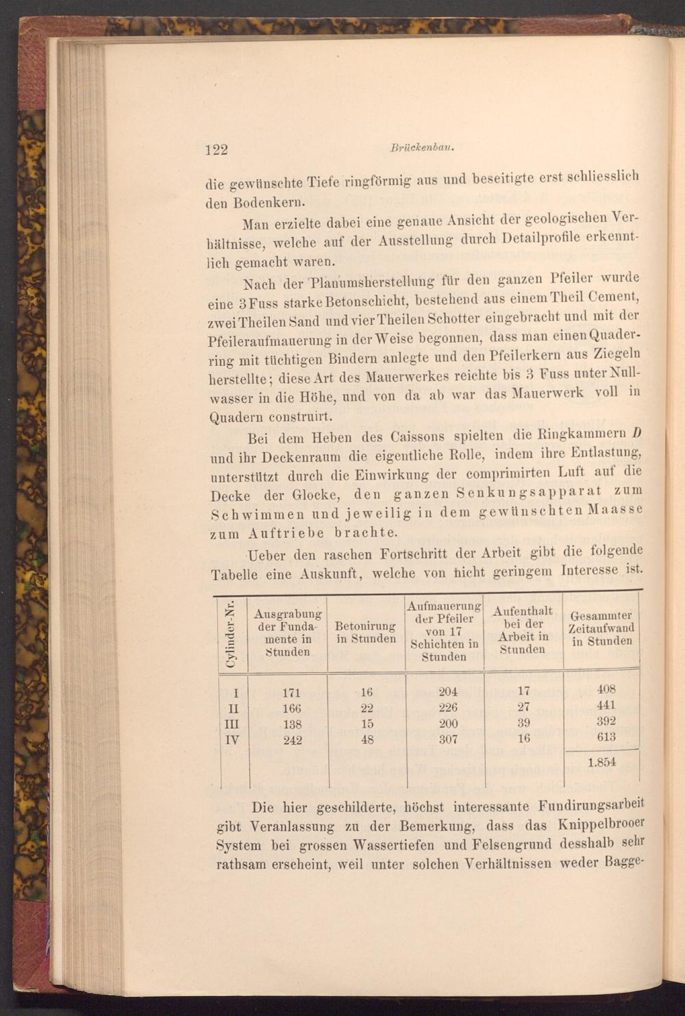 Nach der Planumsherstellung für den ganzen Pfeiler wurde eine 3 Fuss starke Betonschicht, bestehend aus einem Theil Cement, zwei Theilen Sand und vier Theilen Schotter eingebracht und mit der Pfeileraufmauerung in der Weise begonnen, dass man einen Quaderring mit tüchtigen Bindern anlegte und den Pfeilerkern aus Ziegeln herstellte; diese Art des Mauerwerkes reichte bis 3 Fuss unter Nullwasser in die Höhe, und von da ab war das Mauerwerk voll in Quadern construirt.