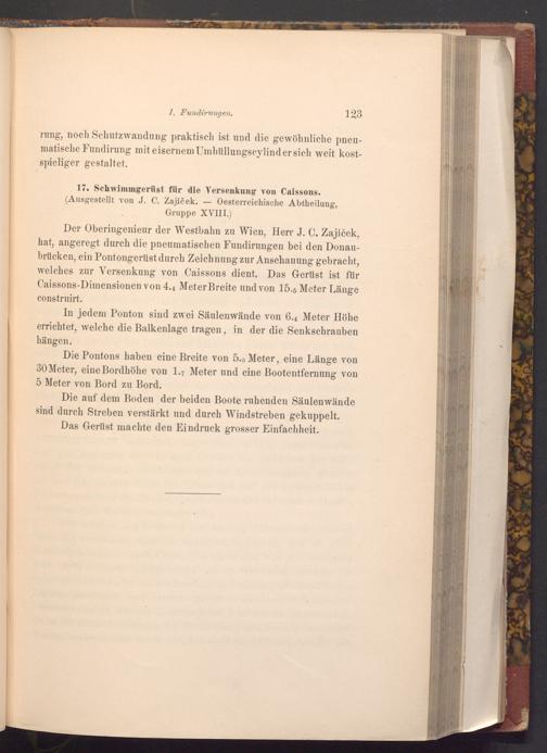 Der Oberingenieur der Westbahn zu Wien, Herr J. C. Zajíček, hat, angeregt durch die pneumatischen Fundirungen bei den Donaubrücken, ein Pontongerüst durch Zeichnung zur Anschauung gebracht, welches zur Versenkung von Caissons dient. Das Gerüst ist für Caissons- Dimensionen von 4.4 Meter Breite und von 15.5 Meter Länge