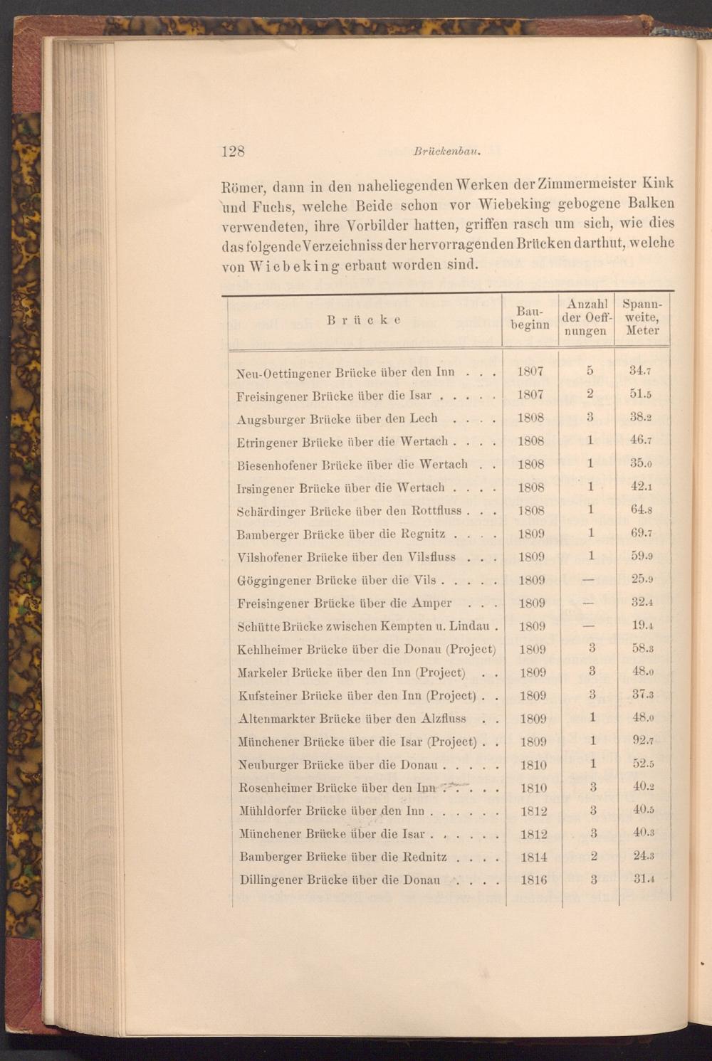 Römer, dann in den naheliegenden Werken der Zimmermeister Kink und Fuchs, welche Beide schon vor Wiebeking gebogene Balken verwendeten, ihre Vorbilder hatten, griffen rasch um sich, wie dies das folgende Verzeichniss der hervorragenden Brücken darthut, welche von Wiebeking erbaut worden sind.
