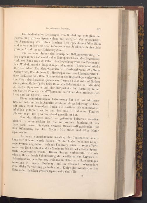 Einen eigenthümlichen Aufschwung hat der Bau hölzerner Brücken bekanntlich in Amerika erfahren, ein Aufschwung, welcher seit circa 1830 besonders durch die dortigen Eisenbahnbauten erheblich gefördert wurde und den uns K. Culmann( Försters ,, Bauzeitung", 1851) so eingehend geschildert hat.