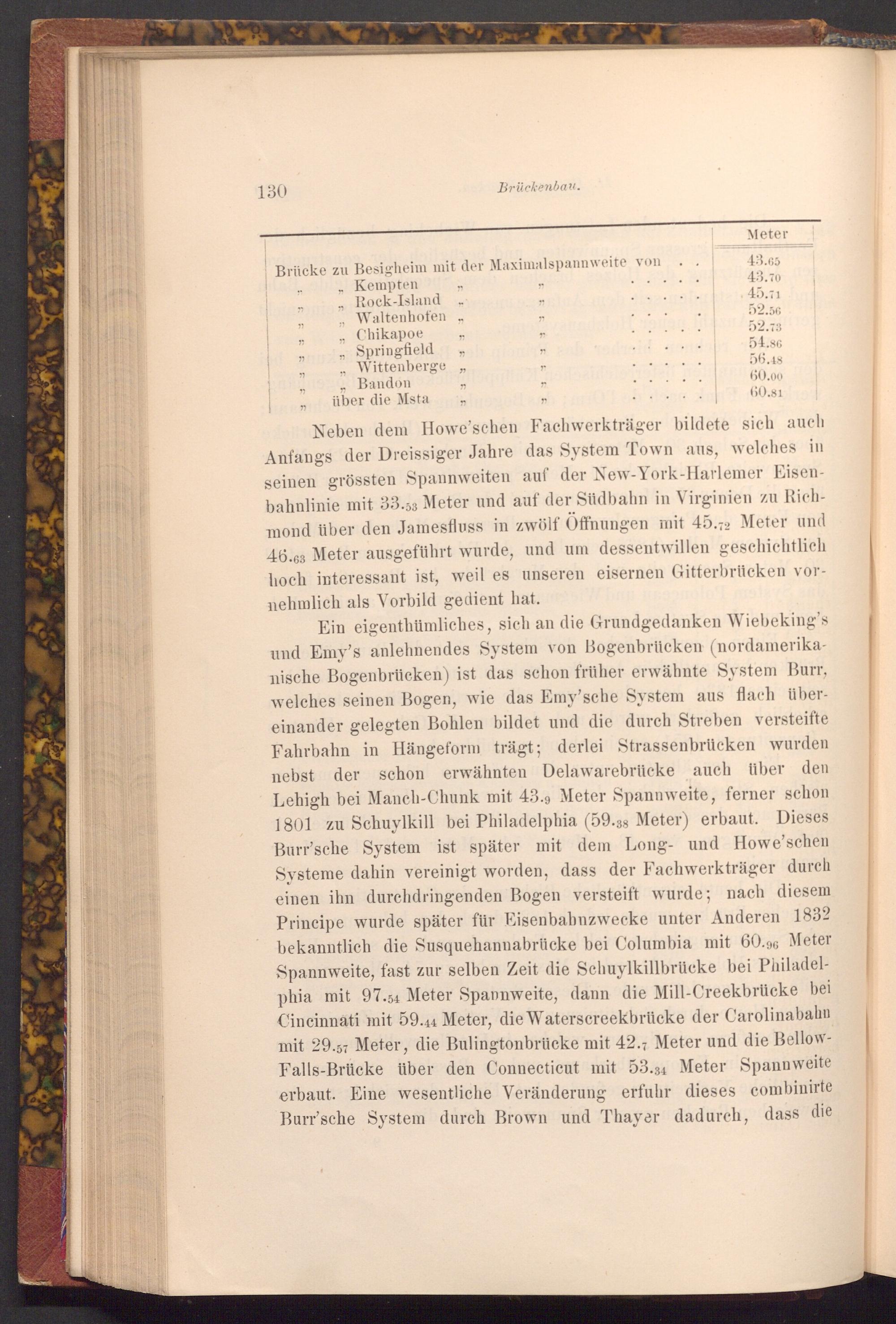 Neben dem Howe'schen Fachwerkträger bildete sich auch Anfangs der Dreissiger Jahre das System Town aus, welches in seinen grössten Spannweiten auf der New- York- Harlemer Eisenbahnlinie mit 33.53 Meter und auf der Südbahn in Virginien zu Richmond über den Jamesfluss in zwölf Öffnungen mit 45.72 Meter und 46.63 Meter ausgeführt wurde, und um dessentwillen geschichtlich hoch interessant ist, weil es unseren eisernen Gitterbrücken vornehmlich als Vorbild gedient hat. polo ms!