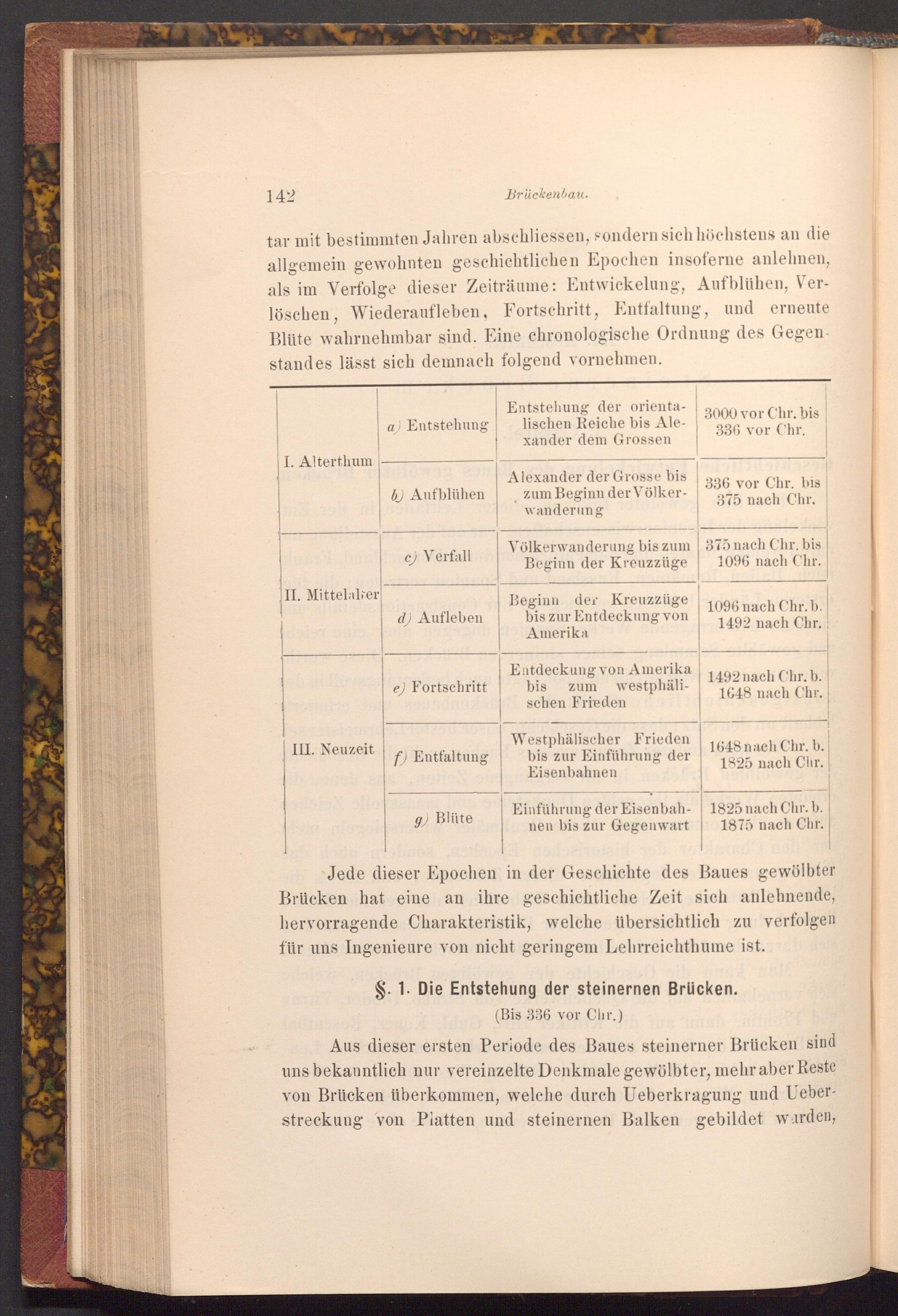 Jede dieser Epochen in der Geschichte des Baues gewölbter Brücken hat eine an ihre geschichtliche Zeit sich anlehnende, hervorragende Charakteristik, welche übersichtlich zu verfolgen für uns Ingenieure von nicht geringem Lehrreichthume ist.