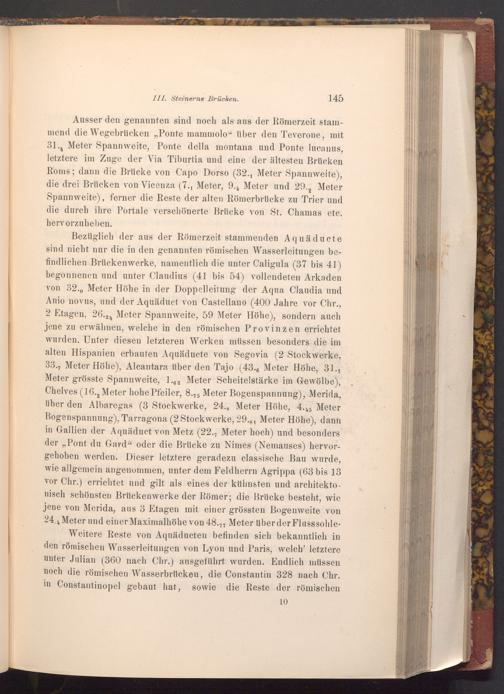 Weitere Reste von Aquäducten befinden sich bekanntlich in den römischen Wasserleitungen von Lyon und Paris, welch' letztere unter Julian( 360 nach Chr.) ausgeführt wurden. Endlich müssen noch die römischen Wasserbrücken, die Constantin 328 nach Chr. in Constantinopel gebaut hat, sowie die Reste der römischen