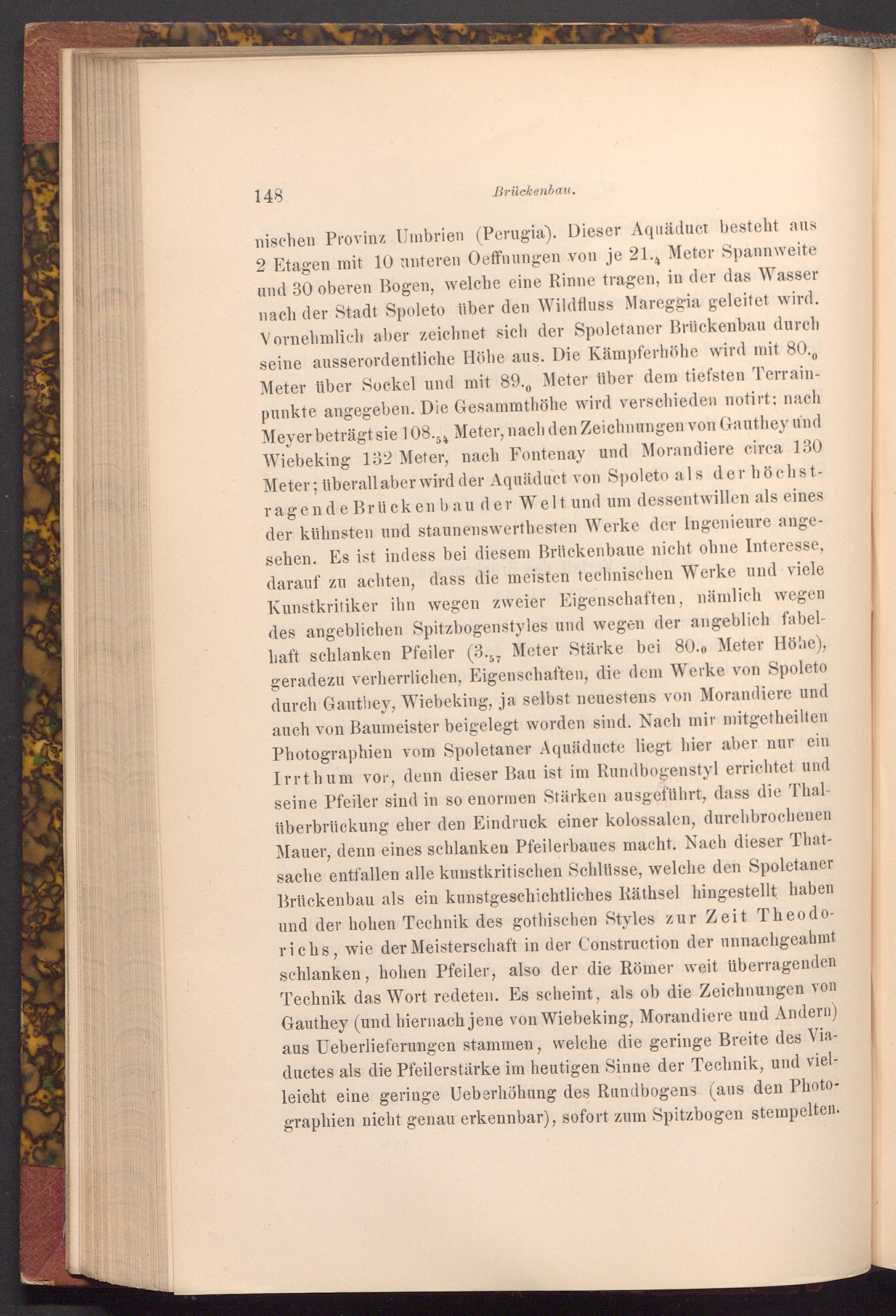 nischen Provinz Umbrien( Perugia). Dieser Aquäduct besteht aus 2 Etagen mit 10 unteren Oeffnungen von je 21., Meter Spannweite und 30 oberen Bogen, welche eine Rinne tragen, in der das Wasser nach der Stadt Spoleto über den Wildfluss Mareggia geleitet wird. Vornehmlich aber zeichnet sich der Spoletaner Brückenbau durch seine ausserordentliche Höhe aus. Die Kämpferhöhe wird mit 80. Meter über Sockel und mit 89., Meter über dem tiefsten Terrainpunkte angegeben. Die Gesammthöhe wird verschieden notirt; nach Meyer beträgt sie 108.54 Meter, nach den Zeichnungen von Gauthey und Wiebeking 132 Meter, nach Fontenay und Morandiere circa 130 Meter; überall aber wird der Aquäduct von Spoleto als der höchstragende Brückenbau der Welt und um dessentwillen als eines der kühnsten und staunenswerthesten Werke der Ingenieure angesehen. Es ist indess bei diesem Brückenbaue nicht ohne Interesse, darauf zu achten, dass die meisten technischen Werke und viele Kunstkritiker ihn wegen zweier Eigenschaften, nämlich wegen des angeblichen Spitzbogenstyles und wegen der angeblich fabelhaft schlanken Pfeiler( 3., Meter Stärke bei 80.0 Meter Höhe), geradezu verherrlichen, Eigenschaften, die dem Werke von Spoleto durch Gauthey, Wiebeking, ja selbst neuestens von Morandiere und auch von Baumeister beigelegt worden sind. Nach mir mitgetheilten Photographien vom Spoletaner Aquäducte liegt hier aber nur ein Irrthum vor, denn dieser Bau ist im Rundbogenstyl errichtet und seine Pfeiler sind in so enormen Stärken ausgeführt, dass die Thalüberbrückung eher den Eindruck einer kolossalen, durchbrochenen Mauer, denn eines schlanken Pfeilerbaues macht. Nach dieser Thatsache entfallen alle kunstkritischen Schlüsse, welche den Spoletaner Brückenbau als ein kunstgeschichtliches Räthsel hingestellt haben und der hohen Technik des gothischen Styles zur Zeit Theodorichs, wie der Meisterschaft in der Construction der unnachgeahmt schlanken, hohen Pfeiler, also der die Römer weit überragenden Technik das Wort redeten. Es scheint, als ob die Zeichnungen von Gauthey( und hiernach jene von Wiebeking, Morandiere und Andern) aus Ueberlieferungen stammen, welche die geringe Breite des Viaductes als die Pfeilerstärke im heutigen Sinne der Technik, und vielleicht eine geringe Ueberhöhung des Rundbogens( aus den Photographien nicht genau erkennbar), sofort zum Spitzbogen stempelten.