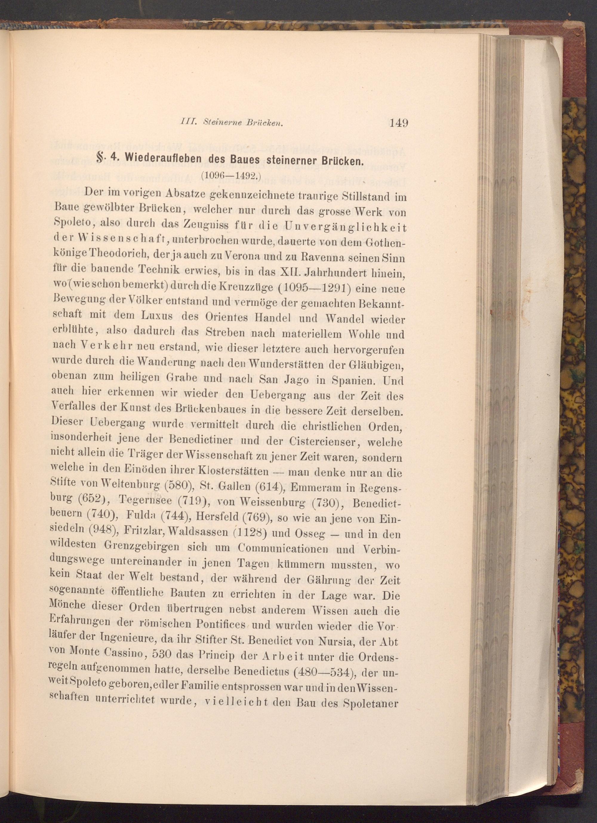 Der im vorigen Absatze gekennzeichnete traurige Stillstand im Baue gewölbter Brücken, welcher nur durch das grosse Werk von Spoleto, also durch das Zeugniss für die Unvergänglichkeit der Wissenschaft, unterbrochen wurde, dauerte von dem Gothenkönige Theodorich, der ja auch zu Verona und zu Ravenna seinen Sinn für die bauende Technik erwies, bis in das XII. Jahrhundert hinein, wo( wie schon bemerkt) durch die Kreuzzüge( 1095-1291) eine neue Bewegung der Völker entstand und vermöge der gemachten Bekanntschaft mit dem Luxus des Orientes Handel und Wandel wieder erblühte, also dadurch das Streben nach materiellem Wohle und nach Verkehr neu erstand, wie dieser letztere auch hervorgerufen wurde durch die Wanderung nach den Wunderstätten der Gläubigen, obenan zum heiligen Grabe und nach San Jago in Spanien. Und auch hier erkennen wir wieder den Uebergang aus der Zeit des Verfalles der Kunst des Brückenbaues in die bessere Zeit derselben. Dieser Uebergang wurde vermittelt durch die christlichen Orden, insonderheit jene der Benedictiner und der Cistercienser, welche nicht allein die Träger der Wissenschaft zu jener Zeit waren, sondern welche in den Einöden ihrer Klosterstätten- man denke nur an die Stifte von Weltenburg( 580), St. Gallen( 614), Emmeram in Regensburg( 652), Tegernsee( 719), von Weissenburg( 730), Benedictbeuern( 740), Fulda( 744), Hersfeld( 769), so wie an jene von Einsiedeln( 948), Fritzlar, Waldsassen( 1128) und Osseg und in den wildesten Grenzgebirgen sich um Communicationen und Verbindungswege untereinander in jenen Tagen kümmern mussten, wo kein Staat der Welt bestand, der während der Gährung der Zeit sogenannte öffentliche Bauten zu errichten in der Lage war. Die Mönche dieser Orden übertrugen nebst anderem Wissen auch die Erfahrungen der römischen Pontifices und wurden wieder die Vorläufer der Ingenieure, da ihr Stifter St. Benedict von Nursia, der Abt von Monte Cassino, 530 das Princip der Arbeit unter die Ordensregeln aufgenommen hatte, derselbe Benedictus( 480-534), der unweit Spoleto geboren, edler Familie entsprossen war und in den Wissenschaften unterrichtet wurde, vielleicht den Bau des Spoletaner