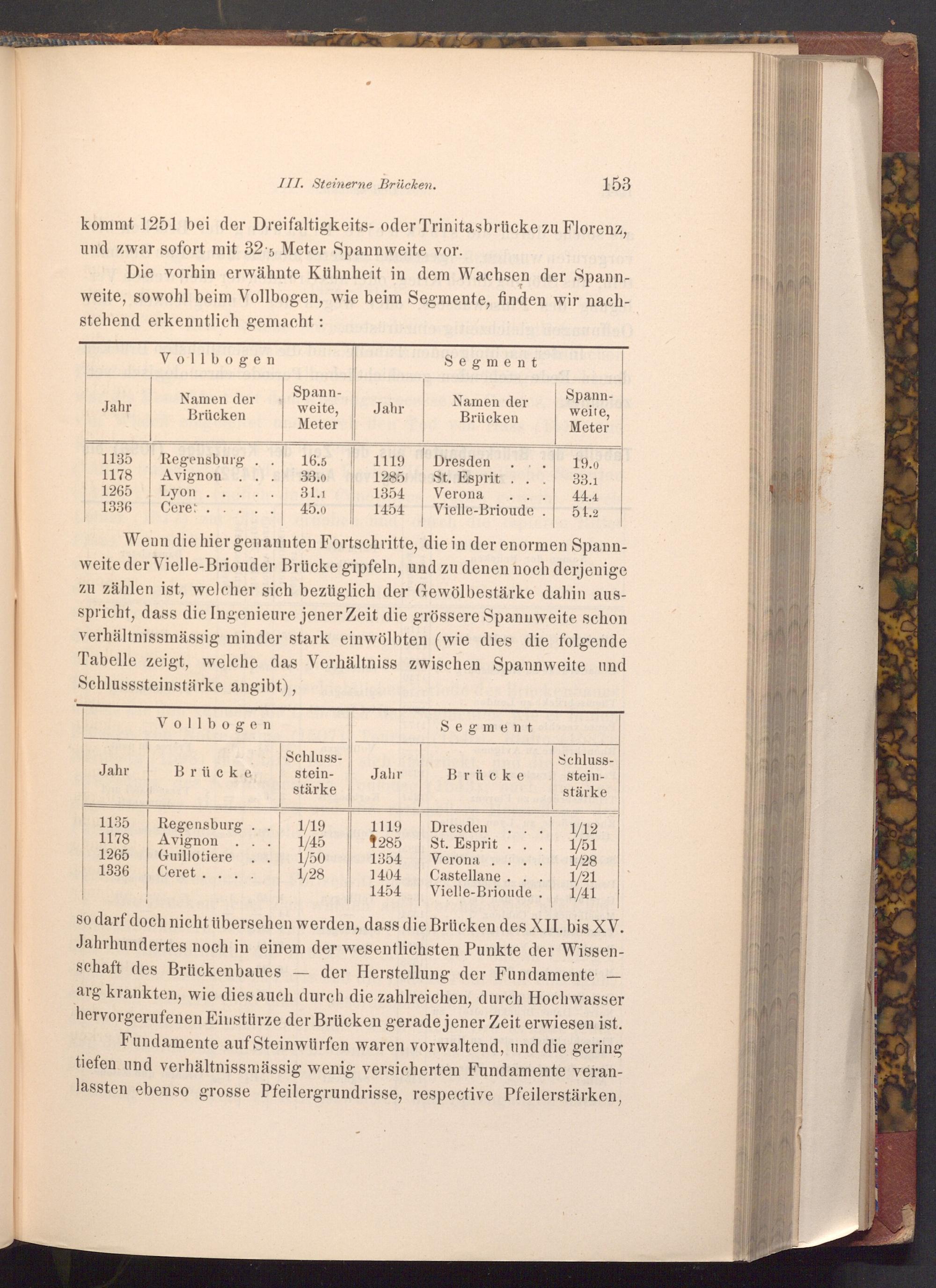 so darf doch nicht übersehen werden, dass die Brücken des XII. bis XV. Jahrhundertes noch in einem der wesentlichsten Punkte der Wissenschaft des Brückenbaues der Herstellung der Fundamente arg krankten, wie dies auch durch die zahlreichen, durch Hochwasser hervorgerufenen Einstürze der Brücken gerade jener Zeit erwiesen ist.