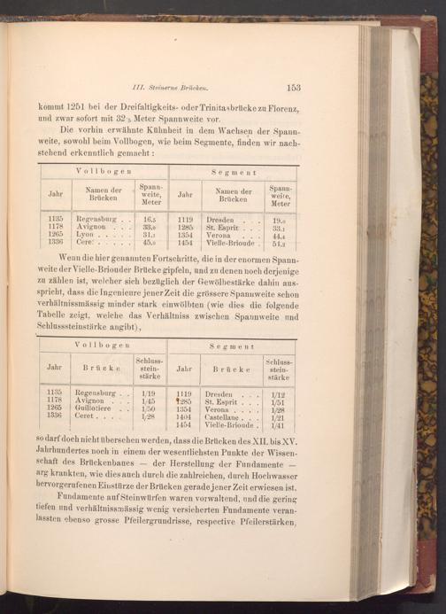 Wenn die hier genannten Fortschritte, die in der enormen Spannweite der Vielle- Briouder Brücke gipfeln, und zu denen noch derjenige zu zählen ist, welcher sich bezüglich der Gewölbestärke dahin ausspricht, dass die Ingenieure jener Zeit die grössere Spannweite schon verhältnissmässig minder stark einwölbten( wie dies die folgende Tabelle zeigt, welche das Verhältniss zwischen Spannweite und Schlusssteinstärke angibt),