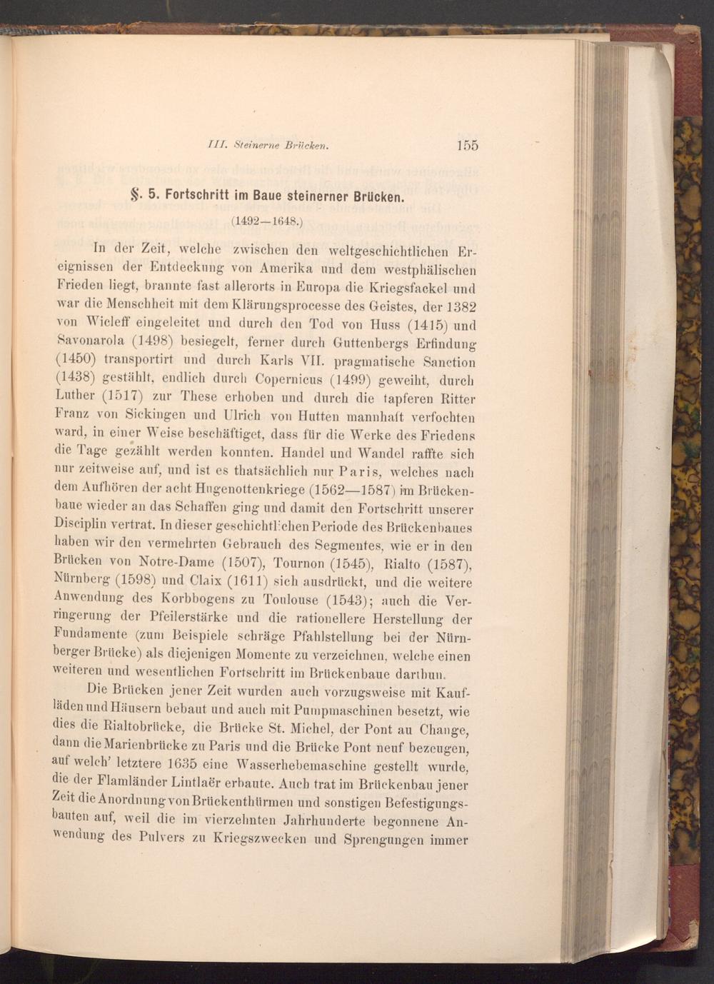 In der Zeit, welche zwischen den weltgeschichtlichen Ereignissen der Entdeckung von Amerika und dem westphälischen Frieden liegt, brannte fast allerorts in Europa die Kriegsfackel und war die Menschheit mit dem Klärungsprocesse des Geistes, der 1382 von Wicleff eingeleitet und durch den Tod von Huss( 1415) und Savonarola( 1498) besiegelt, ferner durch Guttenbergs Erfindung ( 1450) transportirt und durch Karls VII. pragmatische Sanction ( 1438) gestählt, endlich durch Copernicus( 1499) geweiht, durch Luther( 1517) zur These erhoben und durch die tapferen Ritter Franz von Sickingen und Ulrich von Hutten mannhaft verfochten ward, in einer Weise beschäftiget, dass für die Werke des Friedens die Tage gezählt werden konnten. Handel und Wandel raffte sich nur zeitweise auf, und ist es thatsächlich nur Paris, welches nach dem Aufhören der acht Hugenottenkriege( 1562-1587) im Brückenbaue wieder an das Schaffen ging und damit den Fortschritt unserer Disciplin vertrat. In dieser geschichtlichen Periode des Brückenbaues haben wir den vermehrten Gebrauch des Segmentes, wie er in den Brücken von Notre- Dame( 1507), Tournon( 1545), Rialto( 1587), Nürnberg( 1598) und Claix( 1611) sich ausdrückt, und die weitere Anwendung des Korbbogens zu Toulouse( 1543); auch die Verringerung der Pfeilerstärke und die rationellere Herstellung der Fundamente( zum Beispiele schräge Pfahlstellung bei der Nürnberger Brücke) als diejenigen Momente zu verzeichnen, welche einen weiteren und wesentlichen Fortschritt im Brückenbaue darthun.