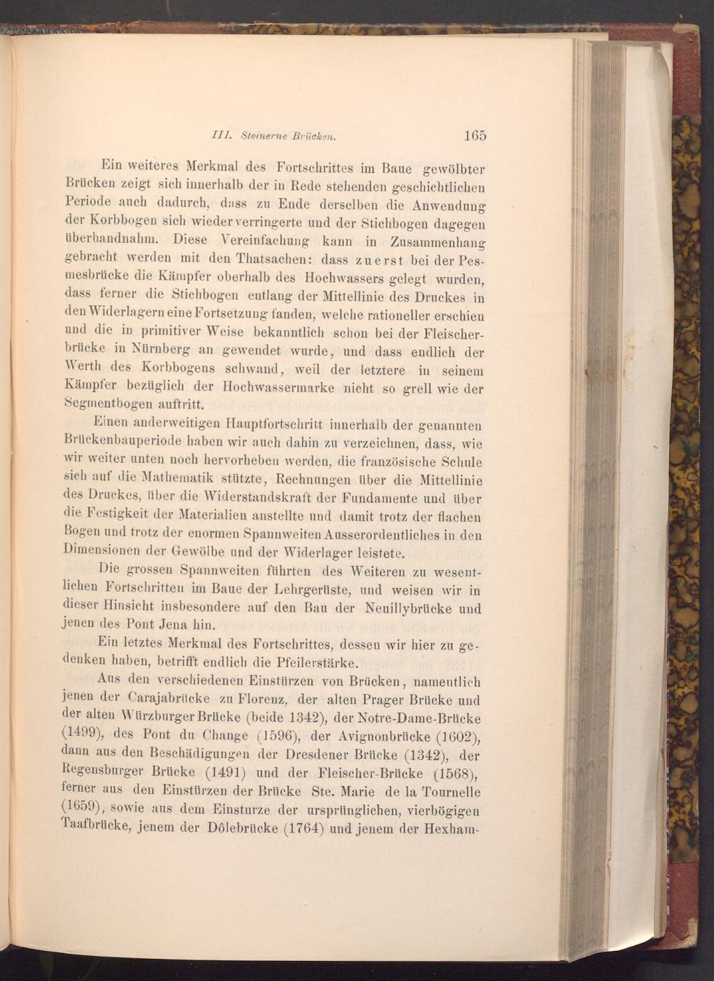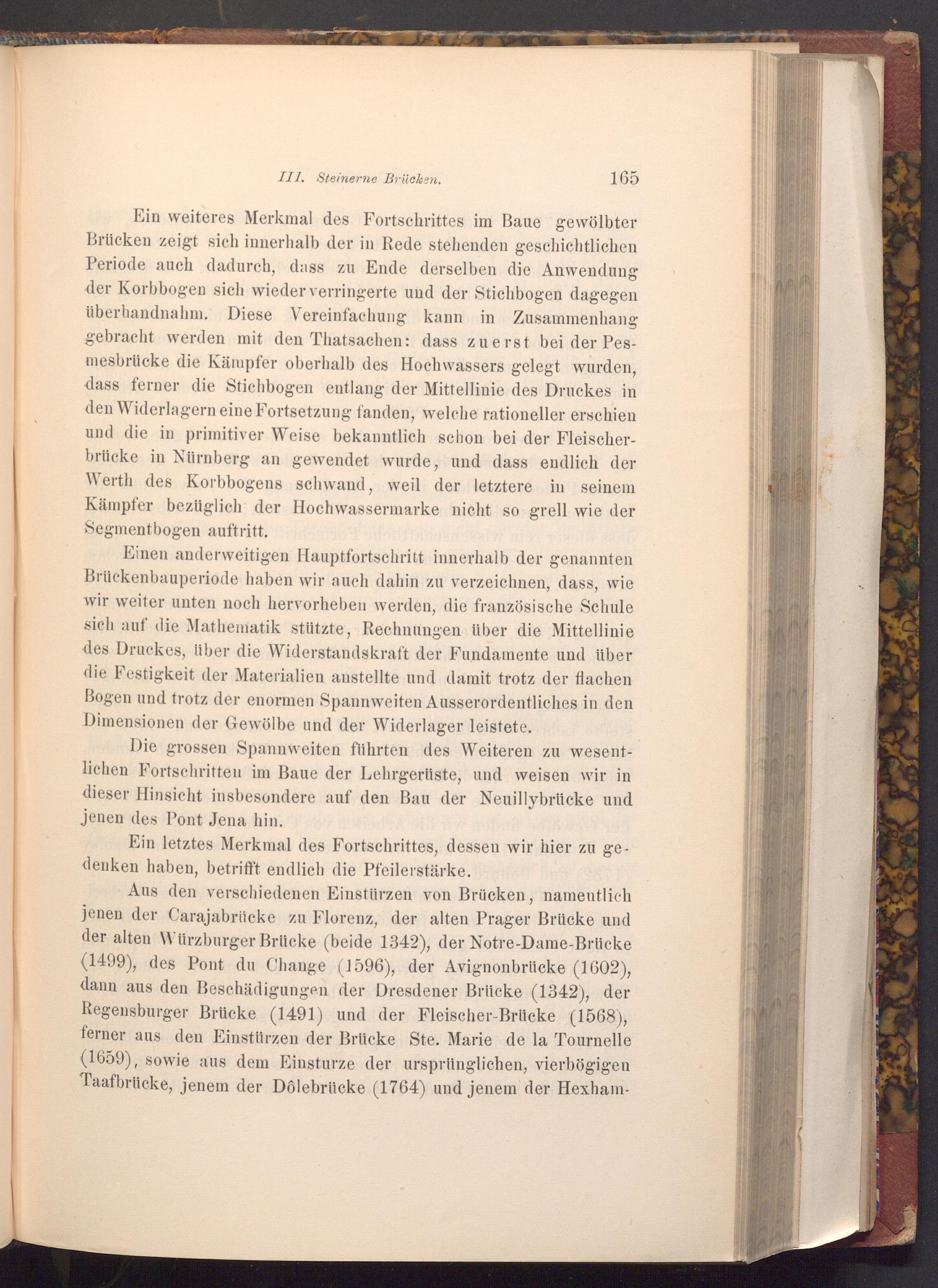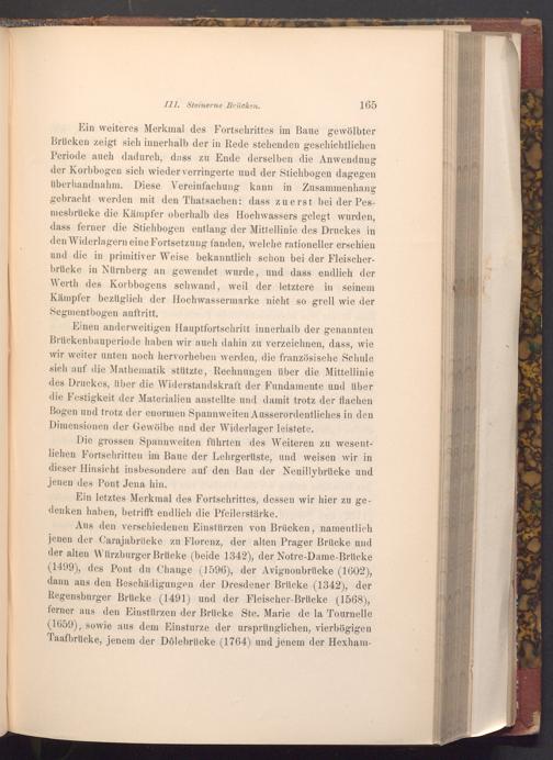 Ein weiteres Merkmal des Fortschrittes im Baue gewölbter Brücken zeigt sich innerhalb der in Rede stehenden geschichtlichen Periode auch dadurch, dass zu Ende derselben die Anwendung der Korbbogen sich wieder verringerte und der Stichbogen dagegen überhandnahm. Diese Vereinfachung kann in Zusammenhang gebracht werden mit den Thatsachen: dass zuerst bei der Pesmesbrücke die Kämpfer oberhalb des Hochwassers gelegt wurden, dass ferner die Stichbogen entlang der Mittellinie des Druckes in den Widerlagern eine Fortsetzung fanden, welche rationeller erschien und die in primitiver Weise bekanntlich schon bei der Fleischerbrücke in Nürnberg an gewendet wurde, und dass endlich der Werth des Korbbogens schwand, weil der letztere in seinem Kämpfer bezüglich der Hochwassermarke nicht so grell wie der Segmentbogen auftritt.