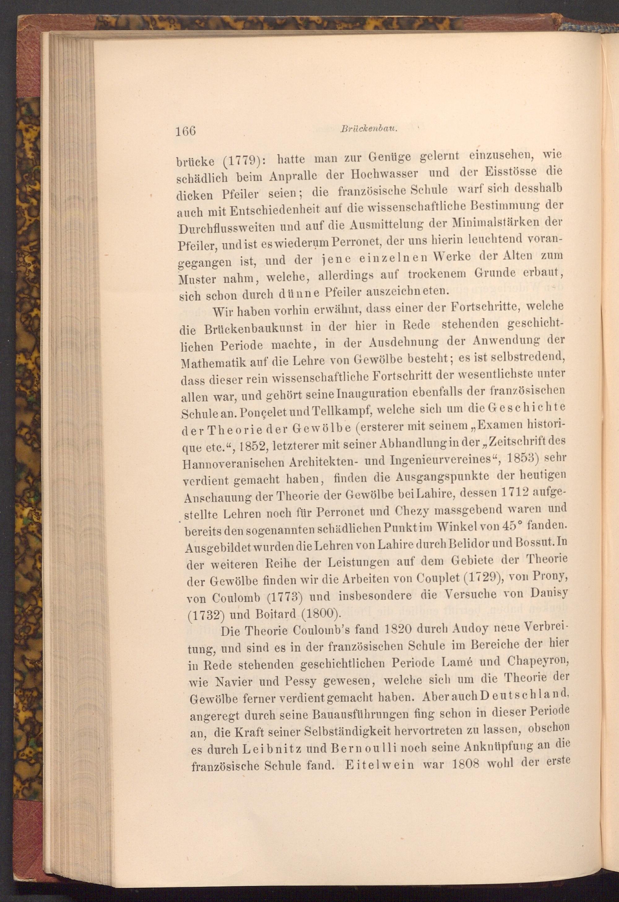 Wir haben vorhin erwähnt, dass einer der Fortschritte, welche die Brückenbaukunst in der hier in Rede stehenden geschichtlichen Periode machte, in der Ausdehnung der Anwendung der Mathematik auf die Lehre von Gewölbe besteht; es ist selbstredend, dass dieser rein wissenschaftliche Fortschritt der wesentlichste unter allen war, und gehört seine Inauguration ebenfalls der französischen Schule an. Ponçelet und Tellkampf, welche sich um die Geschichte der Theorie der Gewölbe( ersterer mit seinem ,, Examen historique etc.", 1852, letzterer mit seiner Abhandlung in der ,, Zeitschrift des Hannoveranischen Architekten- und Ingenieurvereines", 1853) sehr verdient gemacht haben, finden die Ausgangspunkte der heutigen Anschauung der Theorie der Gewölbe bei Lahire, dessen 1712 aufgestellte Lehren noch für Perronet und Chezy massgebend waren und bereits den sogenannten schädlichen Punkt im Winkel von 45° fanden. Ausgebildet wurden die Lehren von Lahire durch Belidor und Bossut. In der weiteren Reihe der Leistungen auf dem Gebiete der Theorie der Gewölbe finden wir die Arbeiten von Couplet( 1729), von Prony, von Coulomb( 1773) und insbesondere die Versuche von Danisy ( 1732) und Boitard( 1800).