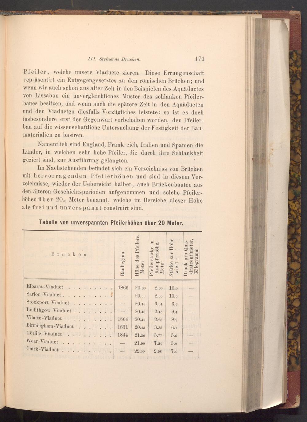 Pfeiler, welche unsere Viaducte zieren. Diese Errungenschaft repräsentirt ein Entgegengesetztes zu den römischen Brücken; und wenn wir auch schon aus alter Zeit in den Beispielen des Aquäductes von Lissabon ein unvergleichliches Muster des schlanken Pfeilerbaues besitzen, und wenn auch die spätere Zeit in den Aquäducten und den Viaducten diesfalls Vorzügliches leistete: so ist es doch insbesondere erst der Gegenwart vorbehalten worden, den Pfeilerbau auf die wissenschaftliche Untersuchung der Festigkeit der Baumaterialien zu basiren.