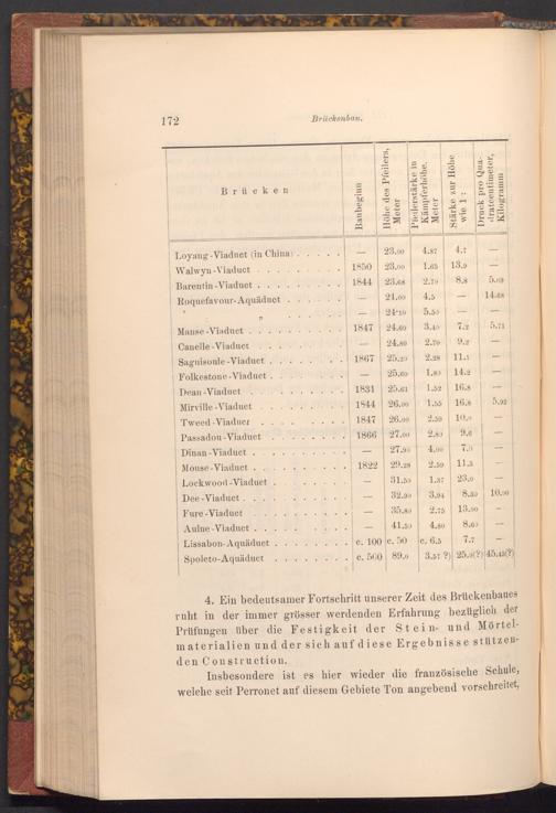 4. Ein bedeutsamer Fortschritt unserer Zeit des Brückenbaues ruht in der immer grösser werdenden Erfahrung bezüglich der Prüfungen über die Festigkeit der Stein- und Mörtelmaterialien und der sich auf diese Ergebnisse stützenden Construction.