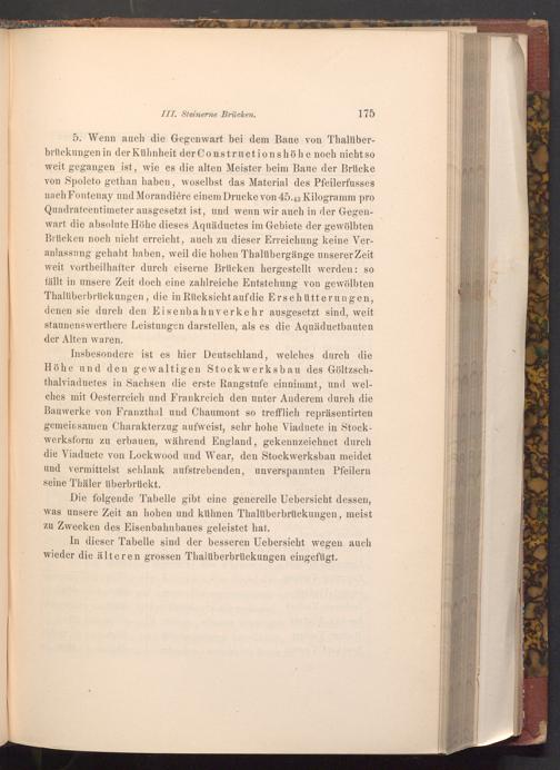 5. Wenn auch die Gegenwart bei dem Baue von Thalüberbrückungen in der Kühnheit der Constructions höhe noch nicht so weit gegangen ist, wie es die alten Meister beim Baue der Brücke von Spoleto gethan haben, woselbst das Material des Pfeilerfusses nach Fontenay und Morandiére einem Drucke von 45.43 Kilogramm pro Quadratcentimeter ausgesetzt ist, und wenn wir auch in der Gegenwart die absolute Höhe dieses Aquäductes im Gebiete der gewölbten Brücken noch nicht erreicht, auch zu dieser Erreichung keine Veranlassung gehabt haben, weil die hohen Thalübergänge unserer Zeit weit vortheilhafter durch eiserne Brücken hergestellt werden: so fällt in unsere Zeit doch eine zahlreiche Entstehung von gewölbten Thalüberbrückungen, die in Rücksicht auf die Erschütterungen, denen sie durch den Eisenbahnverkehr ausgesetzt sind, weit staunenswerthere Leistungen darstellen, als es die Aquäductbauten der Alten waren.