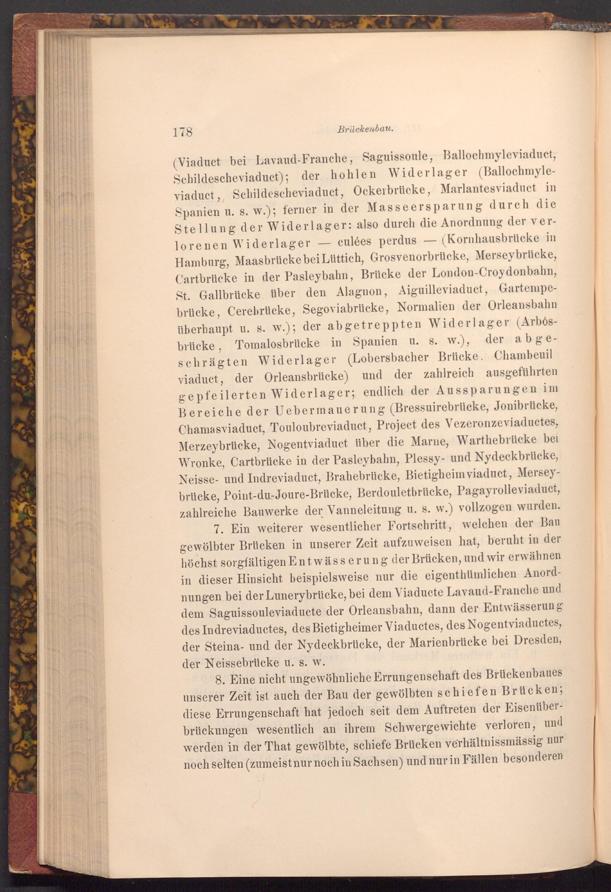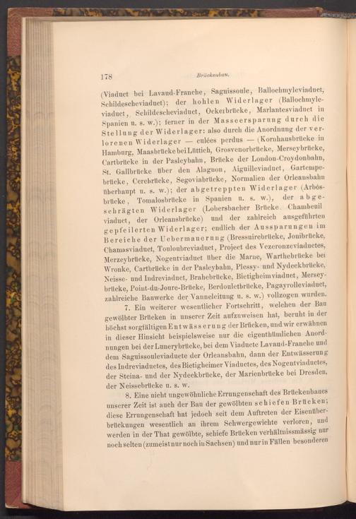 7. Ein weiterer wesentlicher Fortschritt, welchen der Bau gewölbter Brücken in unserer Zeit aufzuweisen hat, beruht in der höchst sorgfältigen Entwässerung der Brücken, und wir erwähnen in dieser Hinsicht beispielsweise nur die eigenthümlichen Anordnungen bei der Lunerybrücke, bei dem Viaducte Lavaud- Franche und dem Saguissouleviaducte der Orleansbahn, dann der Entwässerung des Indreviaductes, des Bietigheimer Viaductes, des Nogentviaductes, der Steina- und der Nydeckbrücke, der Marienbrücke bei Dresden, der Neissebrücke u. s. w.