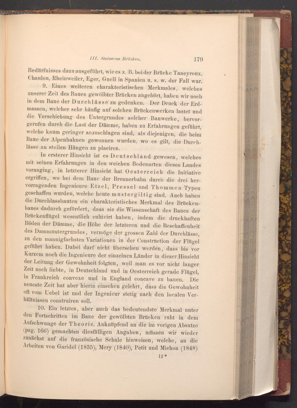 10. Ein letztes, aber auch das bedeutendste Merkmal unter den Fortschritten im Baue der gewölbten Brücken ruht in dem Aufschwunge der Theorie. Anknüpfend an die im vorigen Absatze ( pag. 166) gemachten diesfälligen Angaben, müssen wir wieder zunächst auf die französische Schule hinweisen, welche, an die Arbeiten von Garidel( 1835), Mery( 1840), Petit und Michon( 1848)