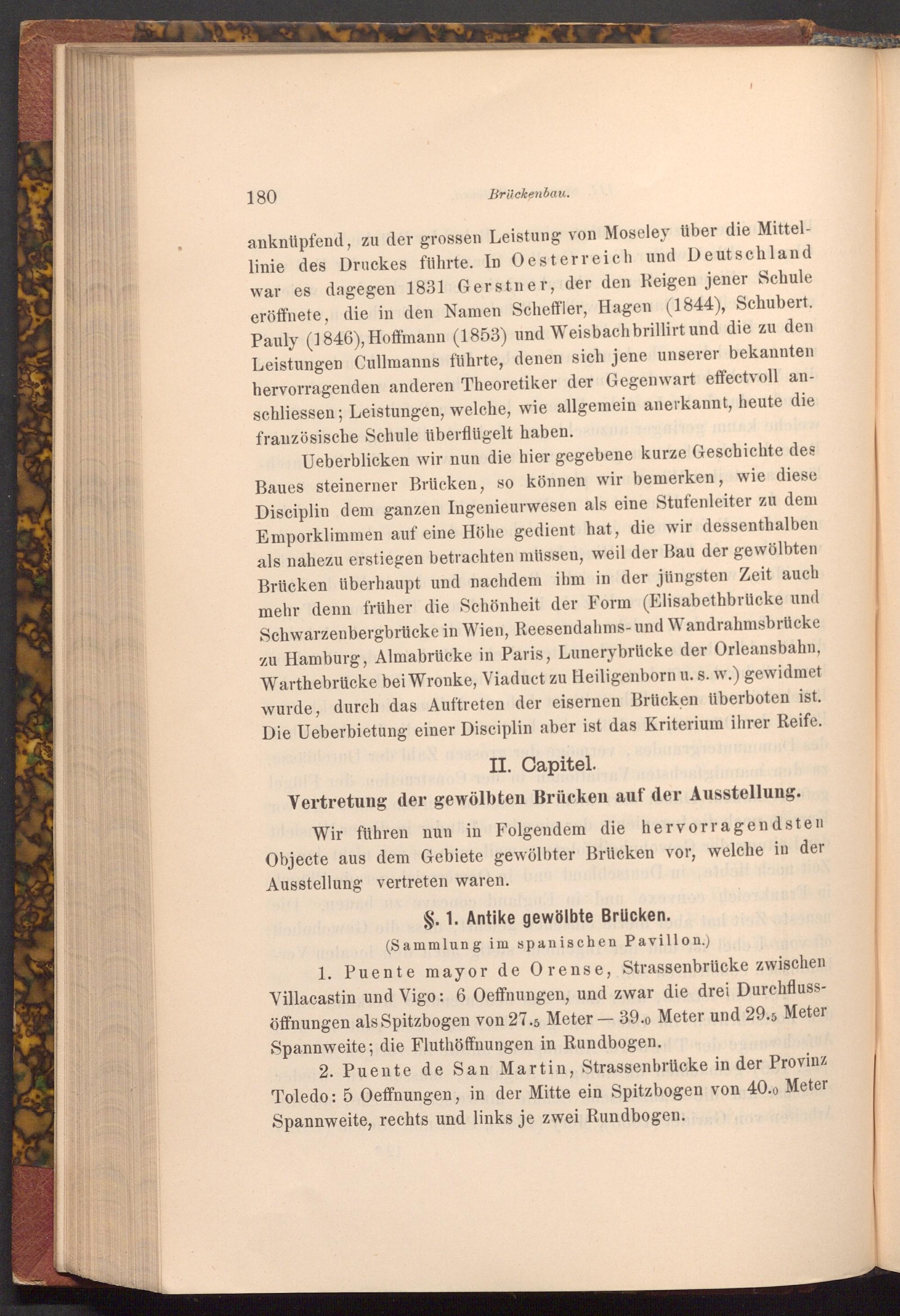 Ueberblicken wir nun die hier gegebene kurze Geschichte des Baues steinerner Brücken, so können wir bemerken, wie diese Disciplin dem ganzen Ingenieurwesen als eine Stufenleiter zu dem Emporklimmen auf eine Höhe gedient hat, die wir dessenthalben als nahezu erstiegen betrachten müssen, weil der Bau der gewölbten Brücken überhaupt und nachdem ihm in der jüngsten Zeit auch mehr denn früher die Schönheit der Form( Elisabethbrücke und Schwarzenbergbrücke in Wien, Reesendahms- und Wandrahmsbrücke zu Hamburg, Almabrücke in Paris, Lunerybrücke der Orleansbahn, Warthebrücke bei Wronke, Viaduct zu Heiligenborn u. s. w.) gewidmet wurde, durch das Auftreten der eisernen Brücken überboten ist. Die Ueberbietung einer Disciplin aber ist das Kriterium ihrer Reife.