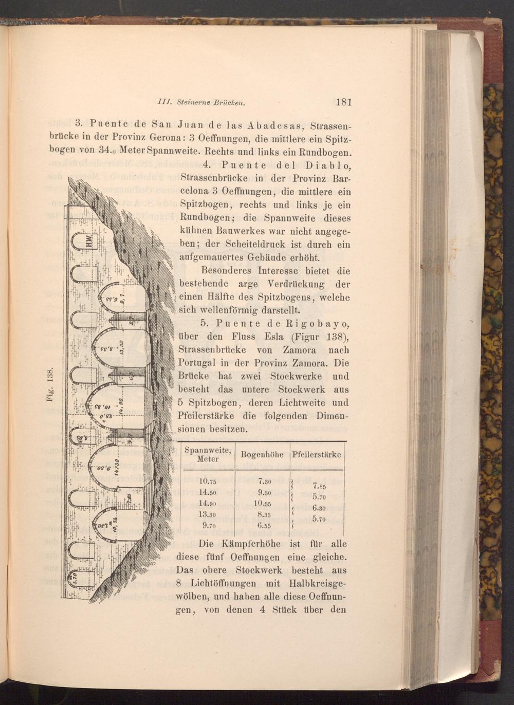 5. Puente de Rigobayo, über den Fluss Esla( Figur 138), Strassenbrücke von Zamora nach Portugal in der Provinz Zamora. Die Brücke hat zwei Stockwerke und besteht das untere Stockwerk aus 5 Spitzbogen, deren Lichtweite und Pfeilerstärke die folgenden Dimensionen besitzen.