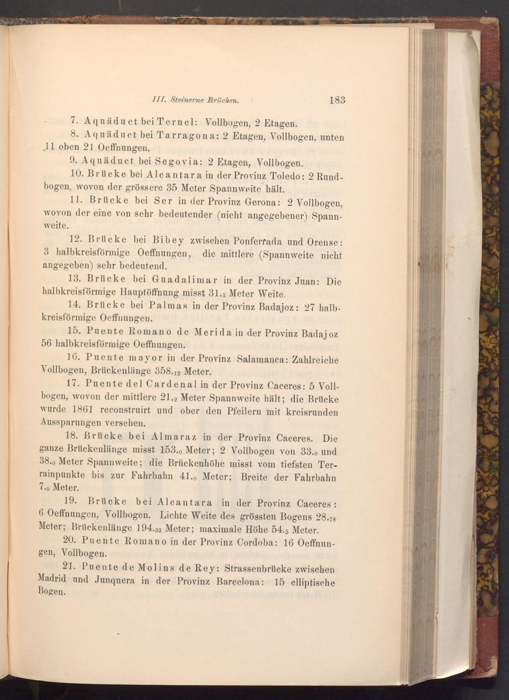 18. Brücke bei Almaraz in der Provinz Caceres. Die ganze Brückenlänge misst 153.0 Meter; 2 Vollbogen von 33.0 und 38.0 Meter Spannweite; die Brückenhöhe misst vom tiefsten Terrainpunkte bis zur Fahrbahn 41.0 Meter; Breite der Fahrbahn 7.0 Meter.