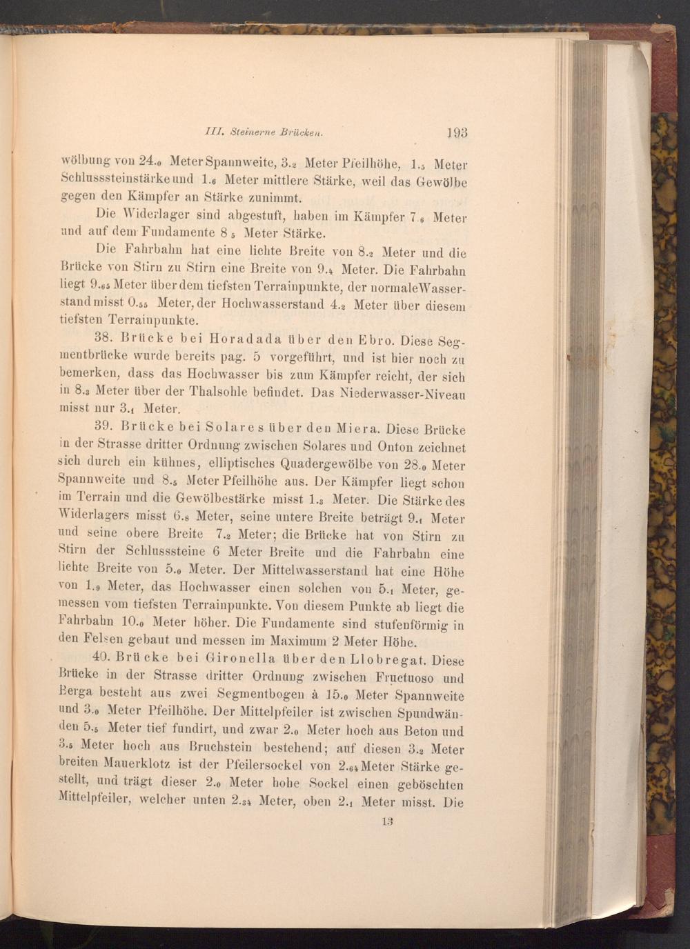 39. Brücke bei Solares über den Miera. Diese Brücke in der Strasse dritter Ordnung zwischen Solares und Onton zeichnet sich durch ein kühnes, elliptisches Quadergewölbe von 28.0 Meter Spannweite und 8.5 Meter Pfeilhöhe aus. Der Kämpfer liegt schon im Terrain und die Gewölbestärke misst 1.3 Meter. Die Stärke des Widerlagers misst 6.8 Meter, seine untere Breite beträgt 9.1 Meter und seine obere Breite 7.2 Meter; die Brücke hat von Stirn zu Stirn der Schlusssteine 6 Meter Breite und die Fahrbahn eine lichte Breite von 5.0 Meter. Der Mittelwasserstand hat eine Höhe von 1.9 Meter, das Hochwasser einen solchen vou 5.1 Meter, gemessen vom tiefsten Terrainpunkte. Von diesem Punkte ab liegt die Fahrbahn 10.0 Meter höher. Die Fundamente sind stufenförmig in den Felsen gebaut und messen im Maximum 2 Meter Höhe.