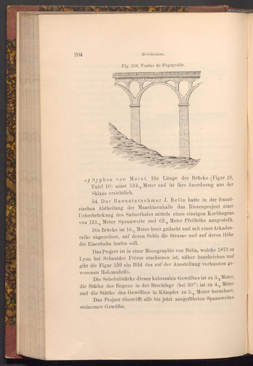 54. Der Bauunternehmer J. Belin hatte in der französischen Abtheilung der Maschinenhalle das Riesenproject einer Ueberbrückung des Saônethales mittels eines einzigen Korbbogens von 131. Meter Spannweite und 62., Meter Pfeilhöhe ausgestellt. Die Brücke ist 16., Meter breit gedacht und mit einer Arkadenreihe angeordnet, auf deren Sohle die Strasse und auf deren Höhe die Eisenbahn laufen soll.